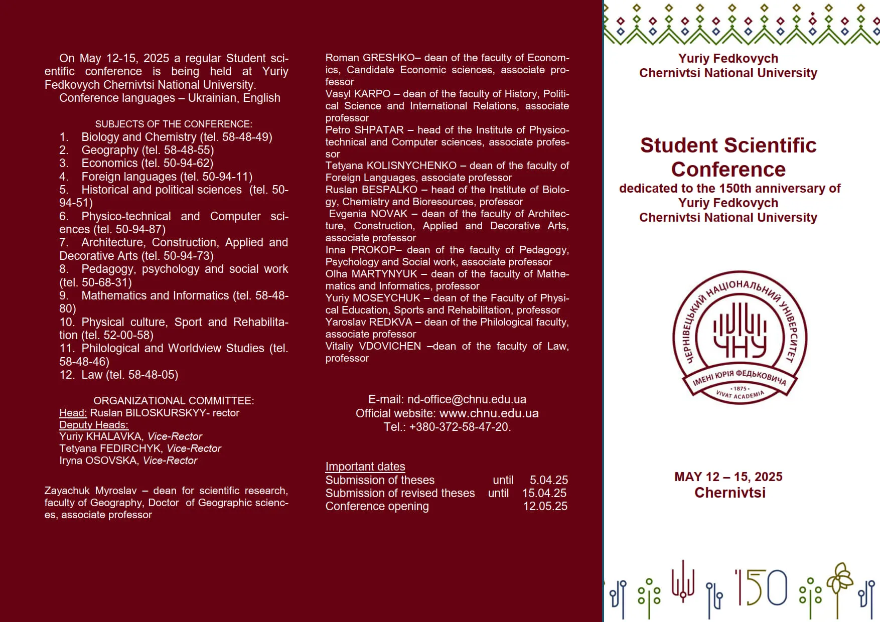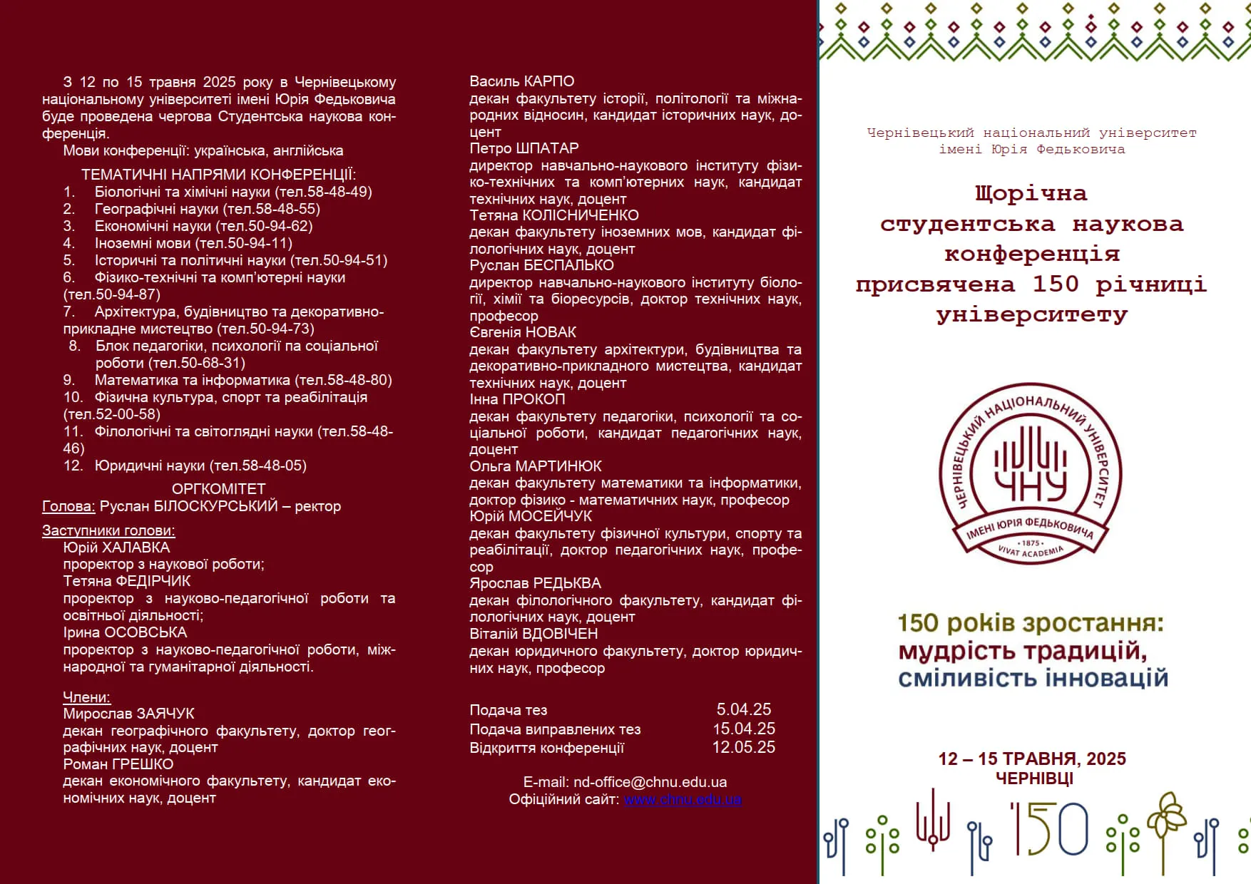 12-15 травня 2025 р. відбудеться чергова студентська наукова конференція. Тези, зміст розділу збірника і програма секційного засідання конференції затверджуються вченою радою інституту/факультету та до 5 квітня 2025 р. подаються у науково-дослідну частину (5 корпус, кімн. 102) та на електронну адресу nd-office@chnu.edu.ua: