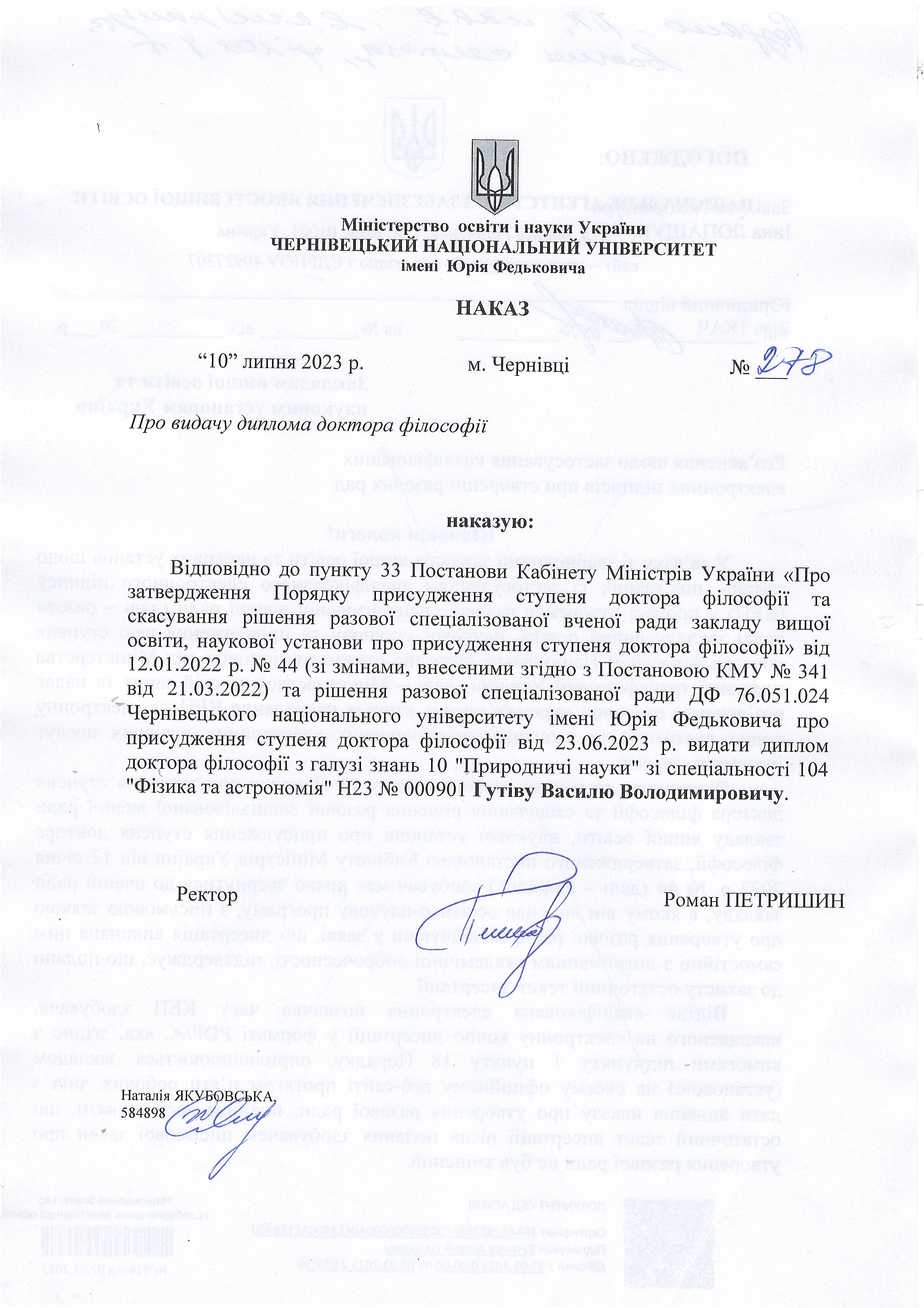 Здобувач наукового ступеня доктора філософії: Гутів Василь Володимирович
