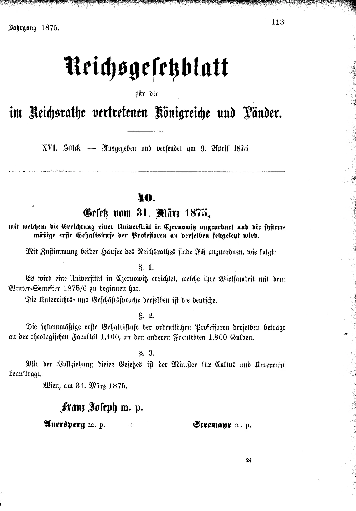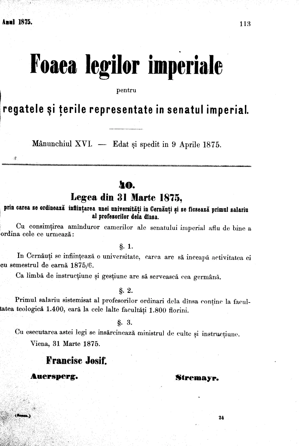 Після тривалих обговорень уряд Австро-Угорщини звернувся до імператора з проханням дозволити заснування університету в Чернівцях. 7 березня 1875 року Франц-Йосиф надав відповідний дозвіл, і вже 31 березня закон був остаточно затверджений.