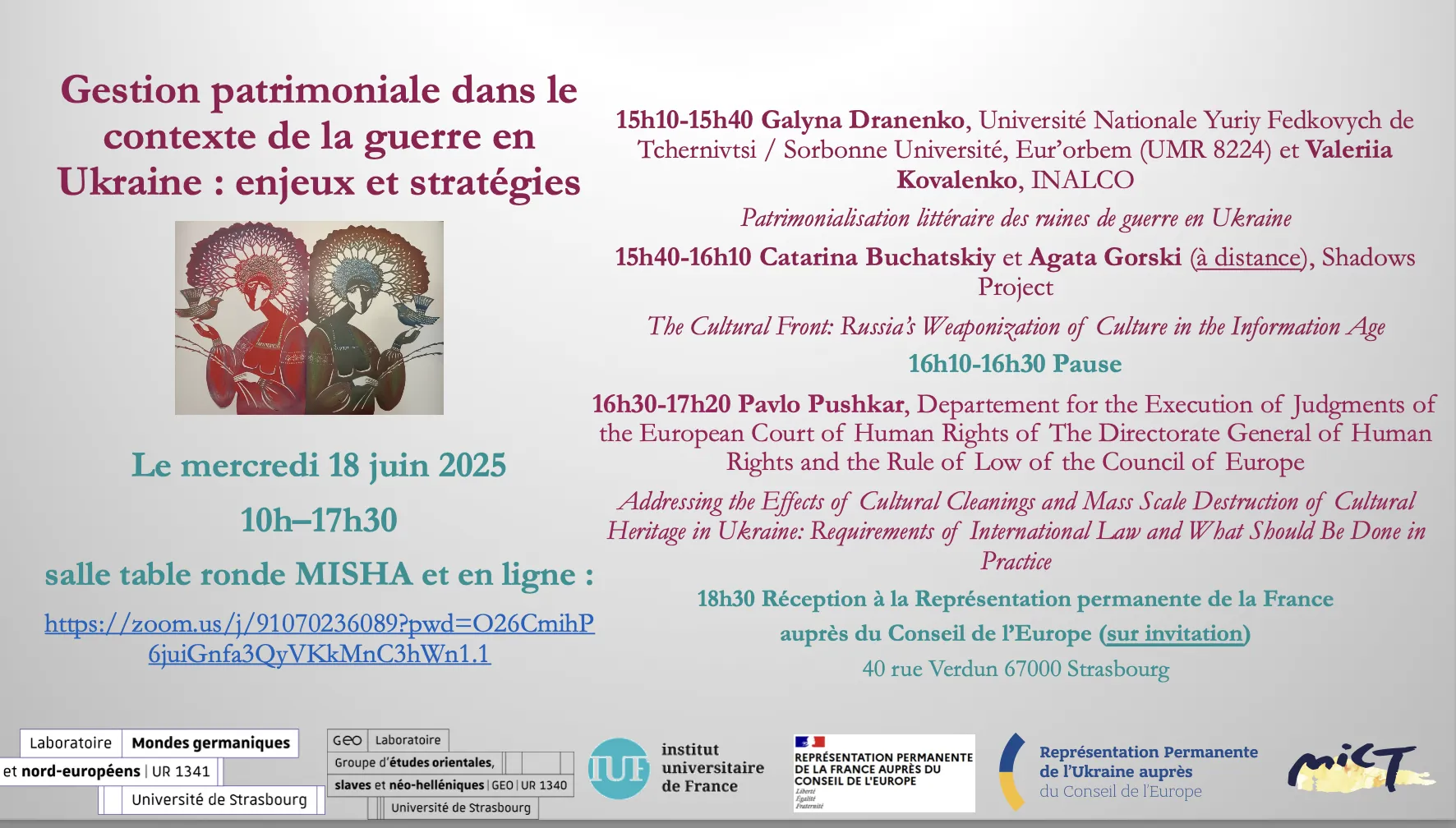 Впродовж 18 та 19 червня у Страсбурзькому університеті відбувався науковий колоквіум «Культурна спадщина України в умовах війни: виклики та стратегії», зорганізований дослідниками наукових лабораторій з дослідження славістики та германістики факультету іноземних мов цього університету (К. Жак, О. Половинко, К. Тарасюк).