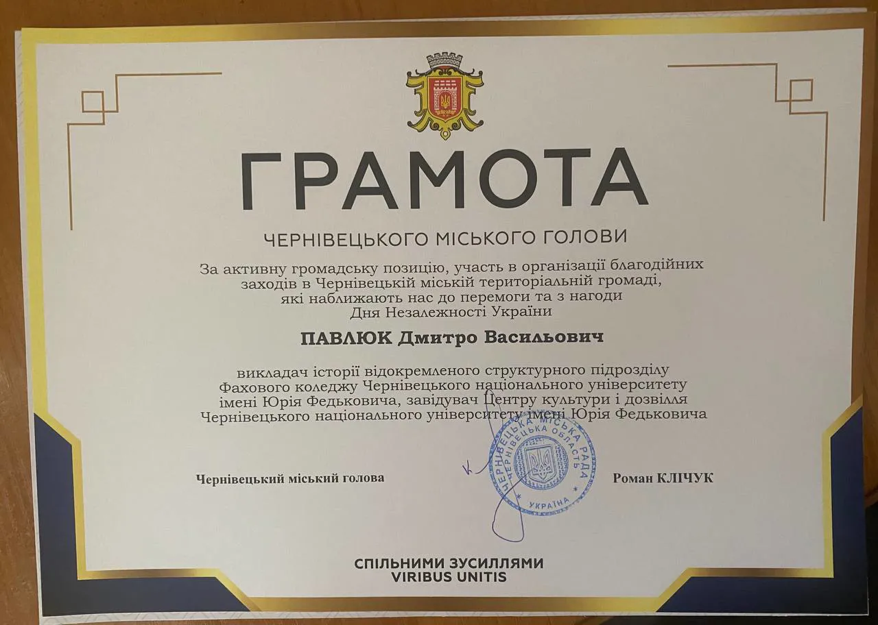 Чернівецький національний університет імені Юрія Федьковича щиро вітає Дмитра Павлюка з отриманням почесної грамоти від Чернівецького міського голови Романа Клічука!