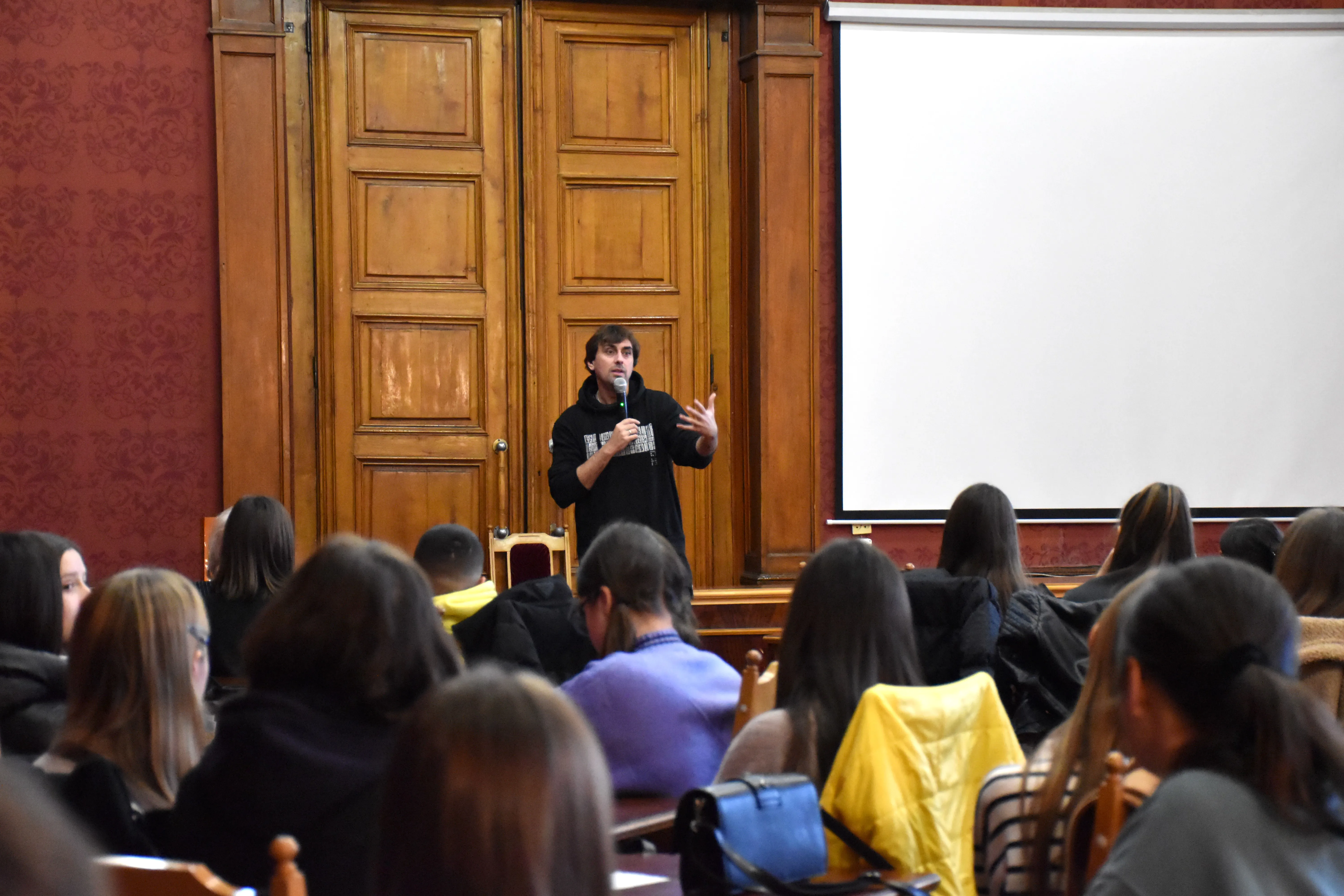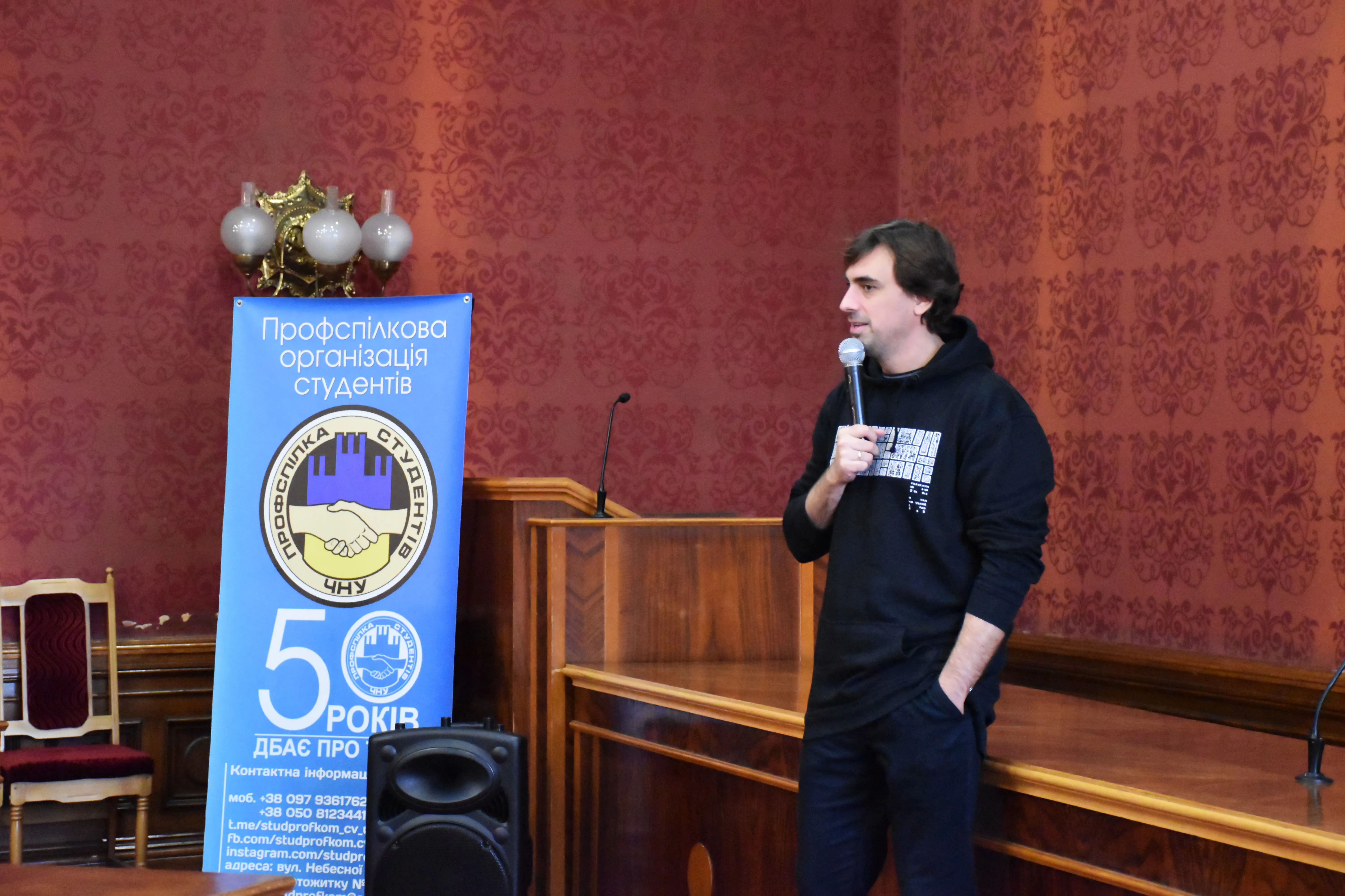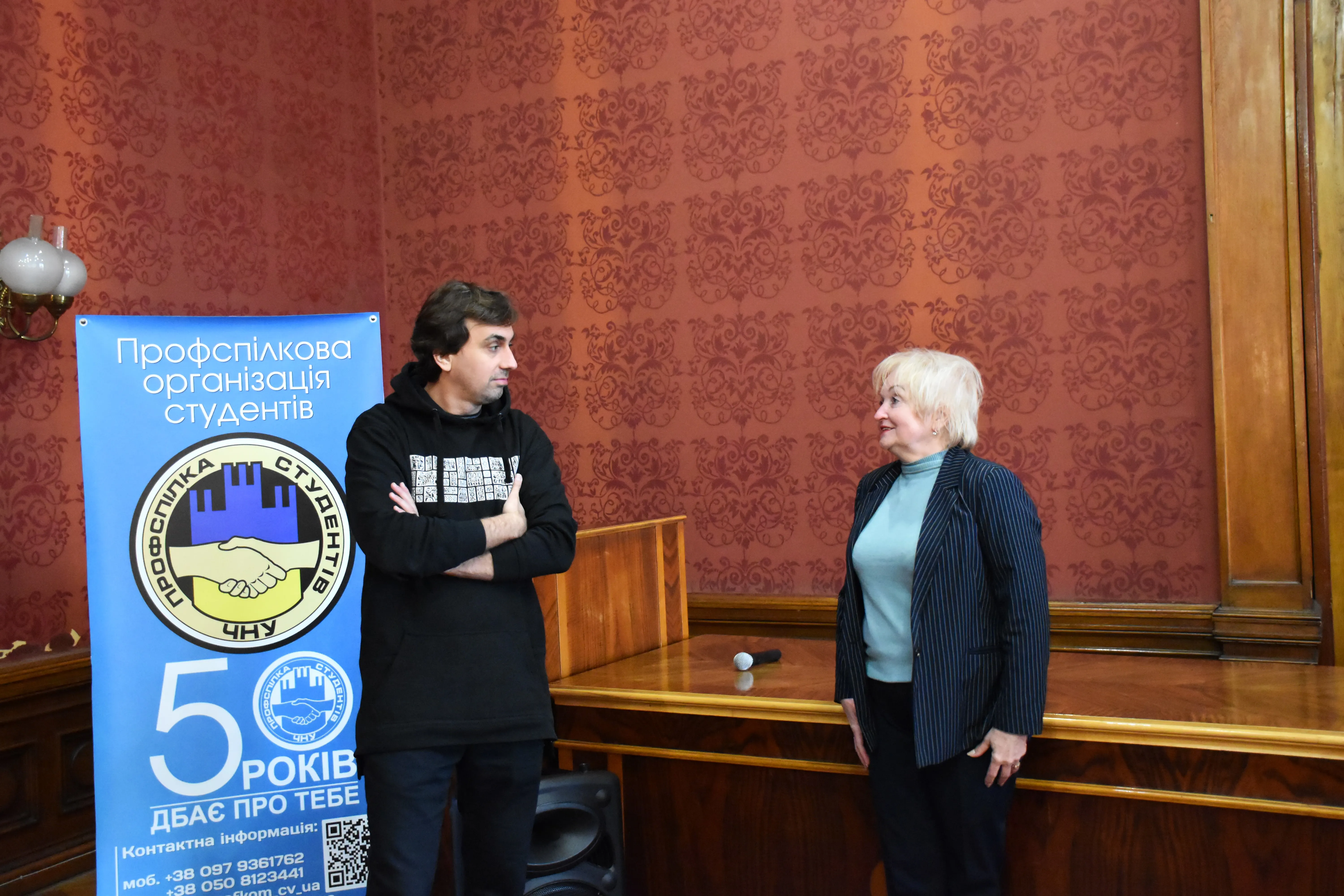 Зустріч у рамках проєкту "На рівних" Профспілкової організації студентів ЧНУ спільно з відділом комунікацій та брендингу Чернівецького національного університету імені Юрія Федьковича об'єднала не лише студентів і працівників університету, а й просто зацікавлену молодь. Привітала гостя проректорка університету Тамара Марусик. Вона поділилася власними думками щодо важливості зберігання, примноження та популяризації української культури.