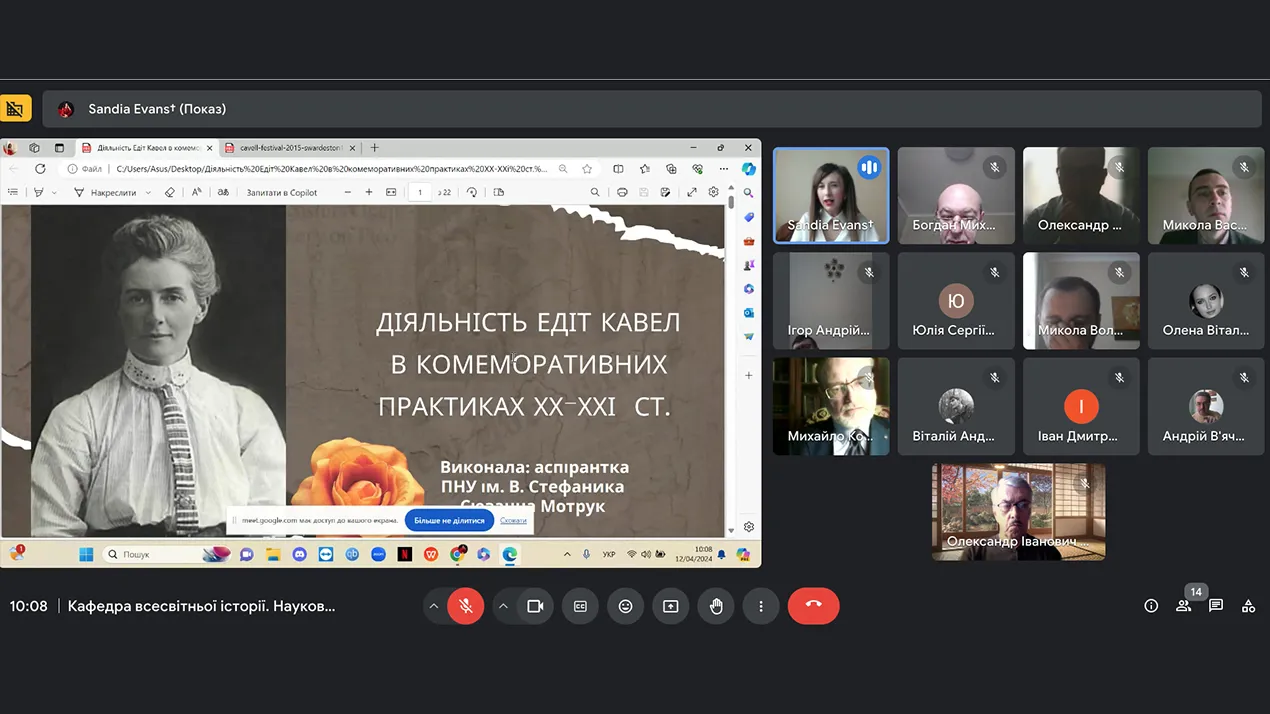 Основним доповідачем виступила аспірантка кафедри всесвітньої історії Прикарпатського національного університету імені Василя Стефаника Сюзанна Мотрук, яка досліджує участь британських жінок у роки Першої світової. Її доповідь, яка супроводжувалася підготовленою презентацією, стосувалася постаті Едіт Кавел - однієї з найвідоміших сестер милосердя та її місця в культурній пам’яті британського суспільства у ХХ – на початку ХХІ ст.