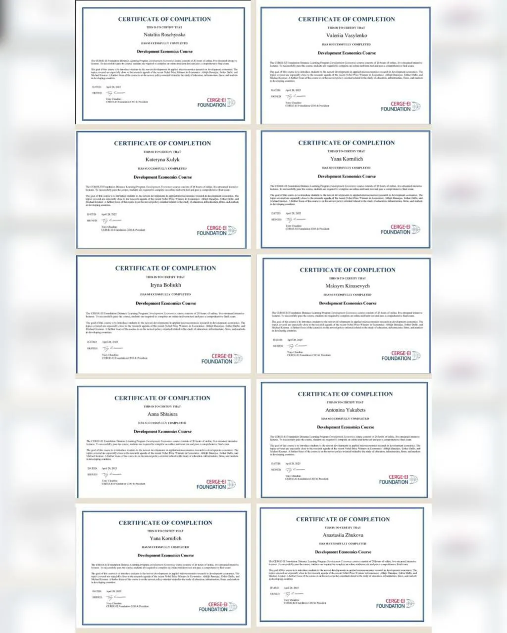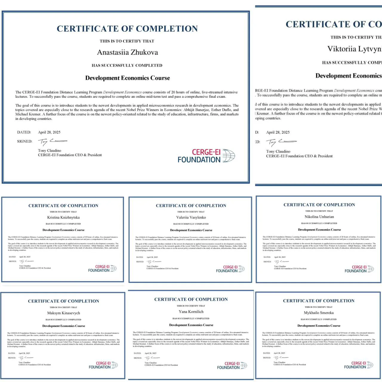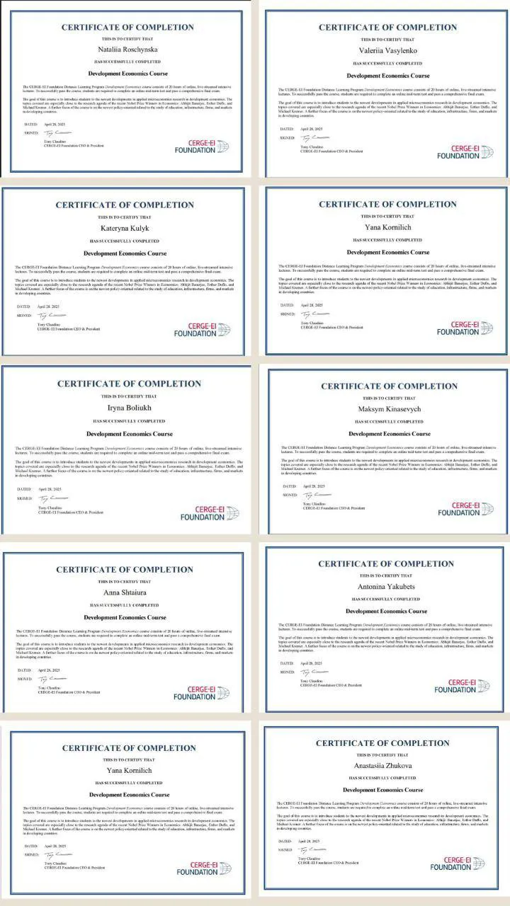 Здобувачі економічного факультету Чернівецького національного університету імені Юрія Федьковича, а також студенти Львівського торговельно-економічного університету успішно завершили міжнародну освітню програму «Development Economics», реалізовану CERGEEI Foundation — Інститутом економіки Чеської академії наук.