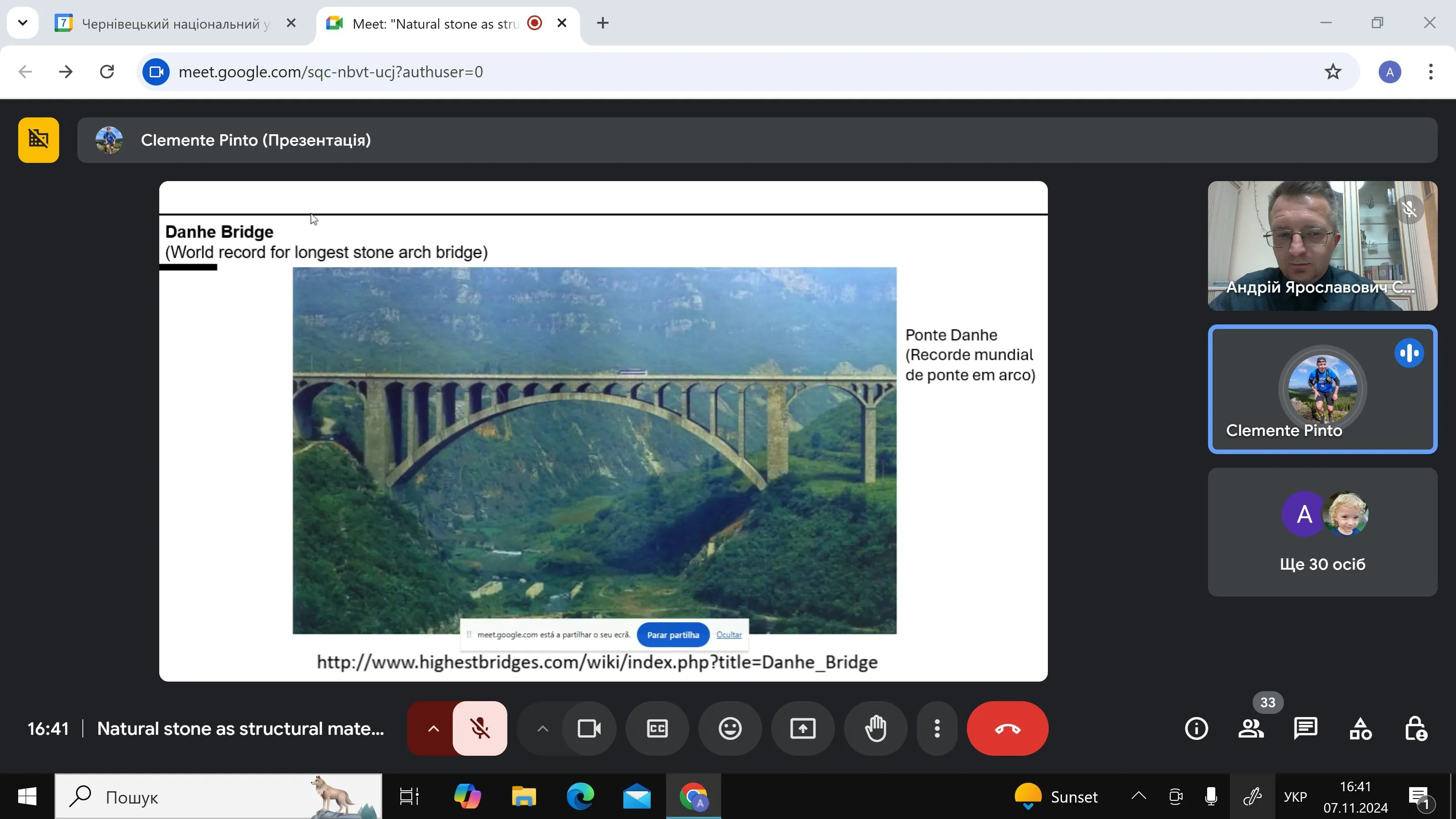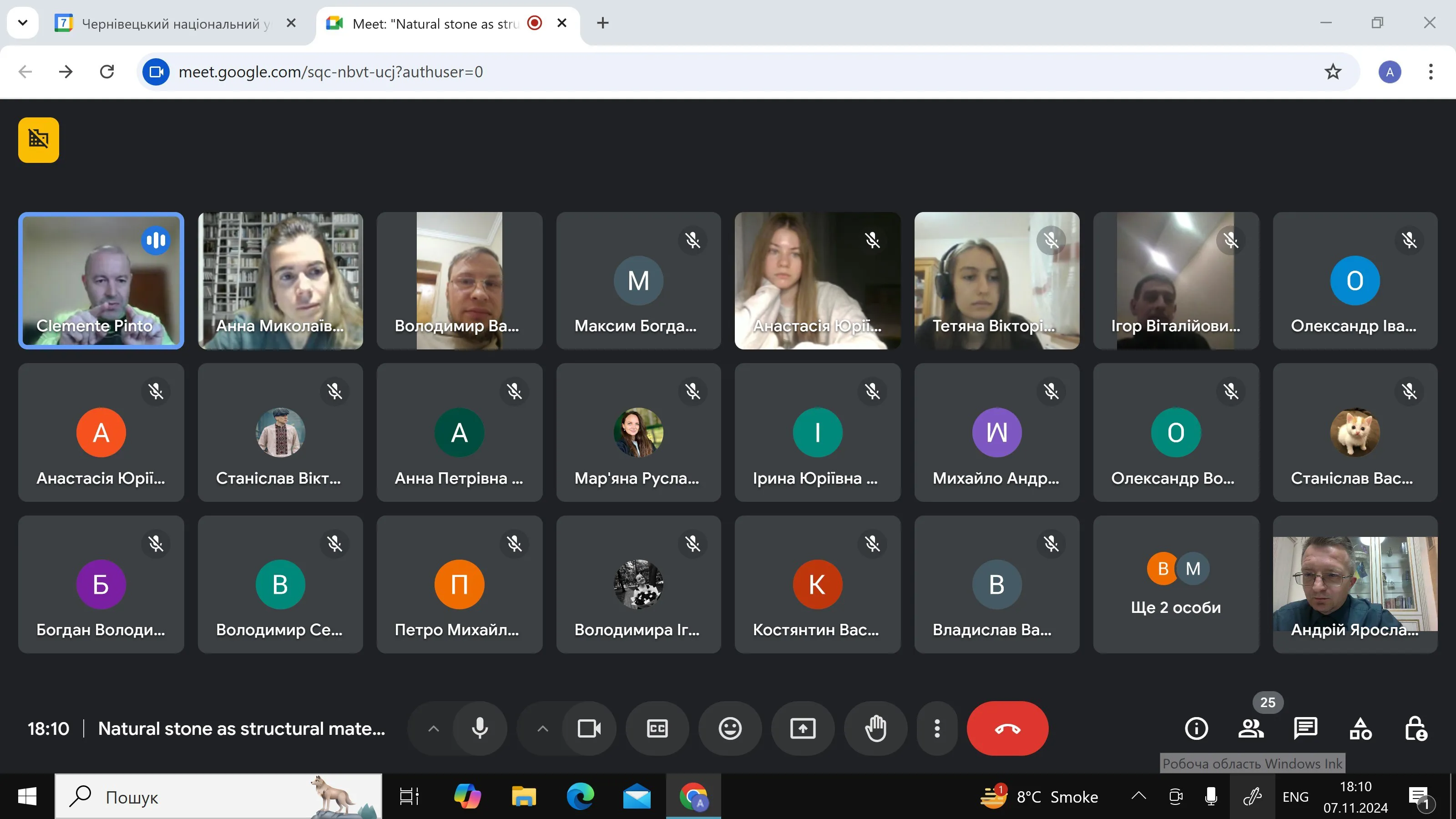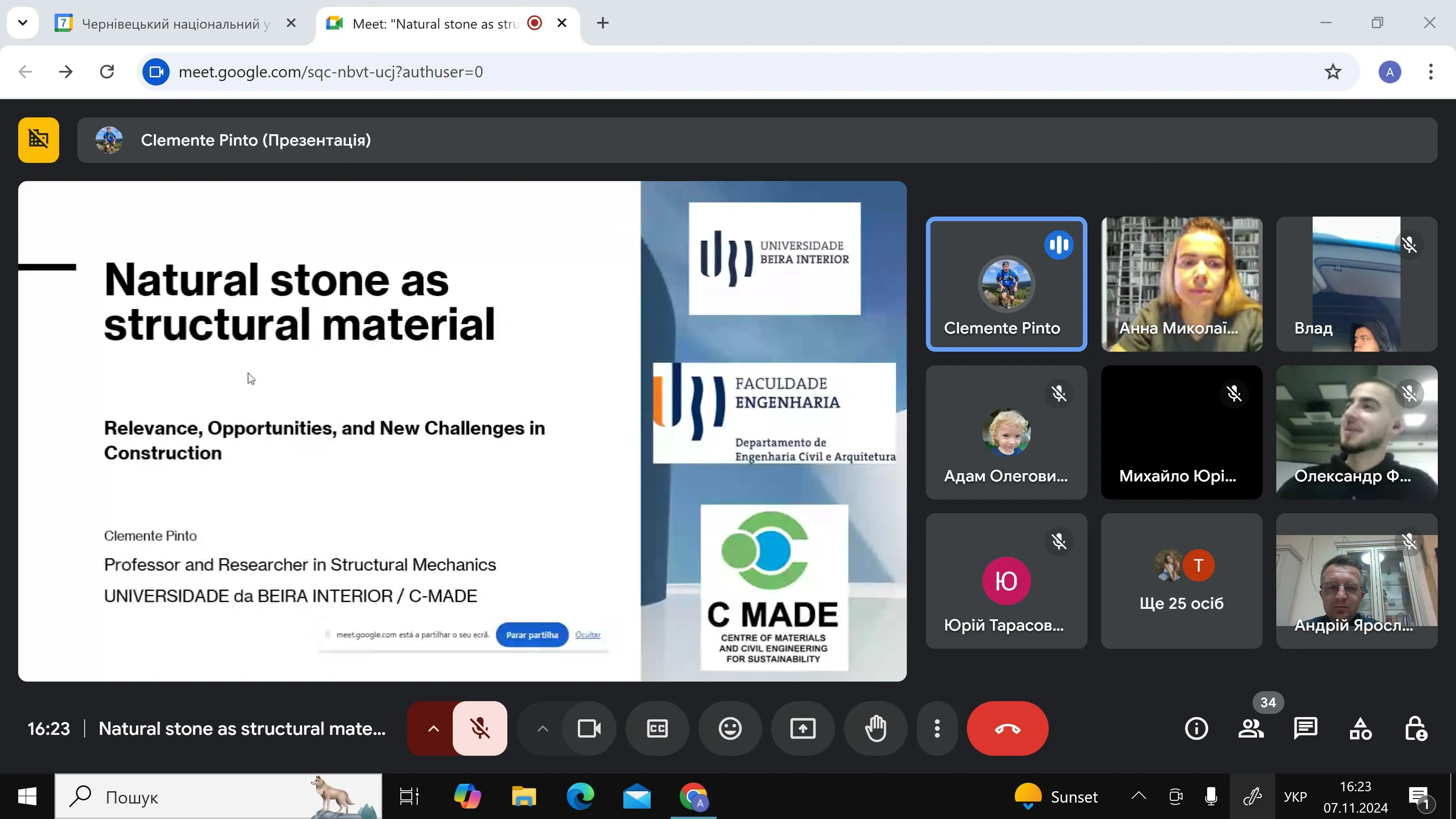 7 листопада професор Клементе Пінто з Університету Внутрішньої Бейри (м. Ковілья, Португалія) провів онлайн-лекцію для студентів кафедри будівництва та інших зацікавлених осіб на тему «Природний камінь як конструкційний матеріал». Лектор детально розглянув значення природного каменю в сучасному будівництві, його історичне використання, а також новітні технології обробки та застосування цього матеріалу.