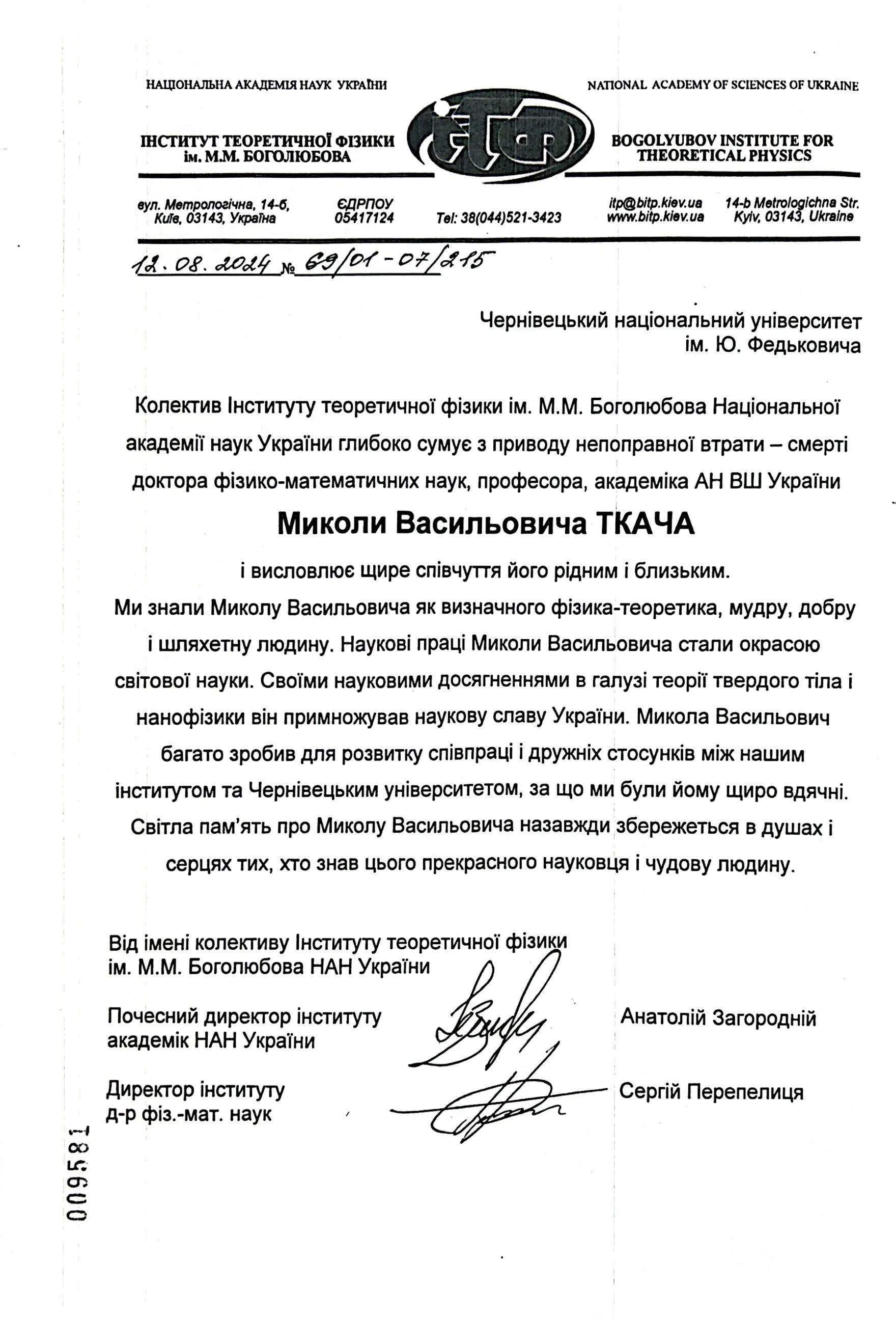 Смерть Миколи Ткача – це велика втрата для наукової спільноти України, для Чернівецького національного університету імені Юрія Федьковича та для кожного, хто його знав. Пам'ять про видатного вченого і педагога житиме в серцях його учнів та колег.
