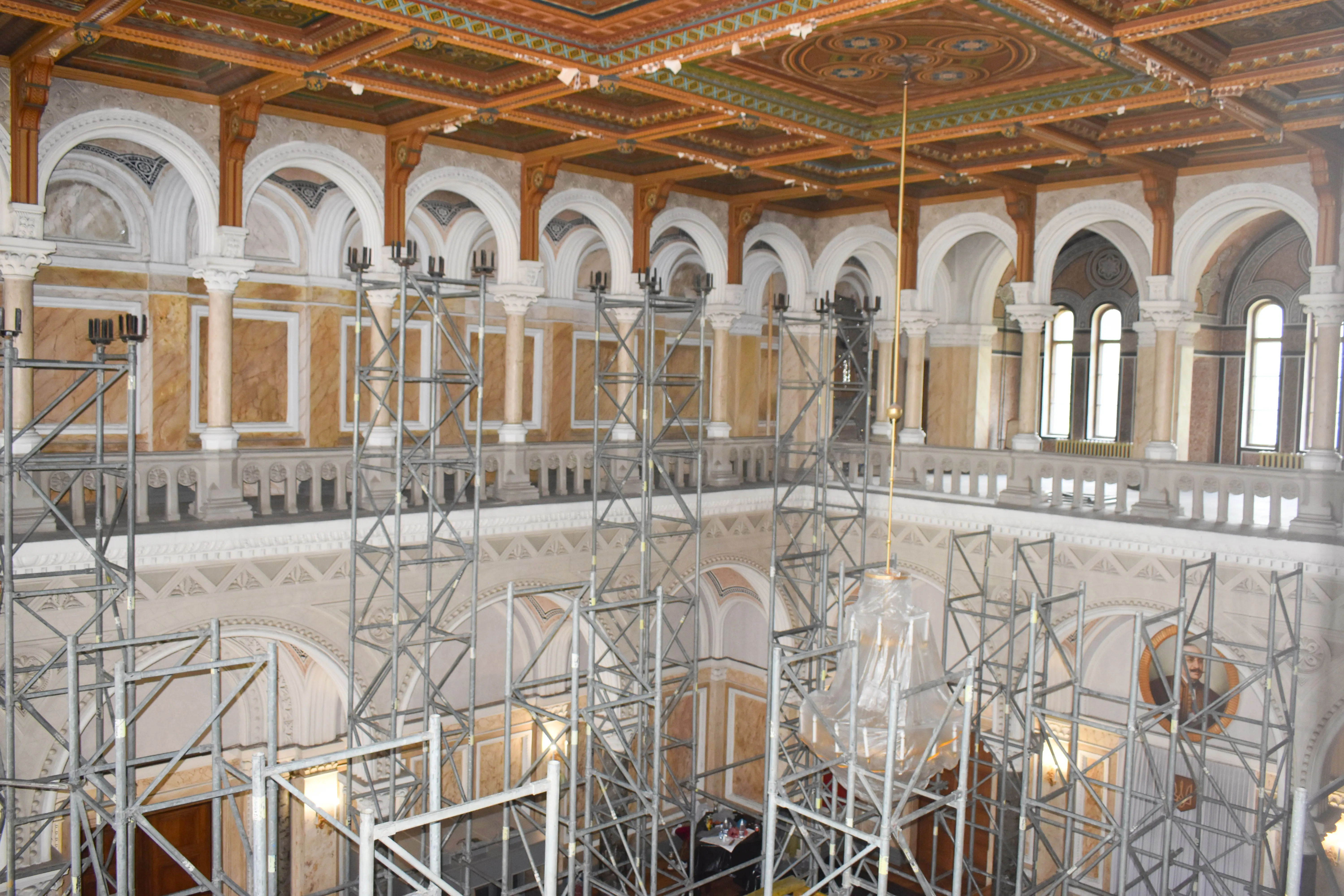 Розпочалася довгоочікувана реалізація грантового проєкту «Реставрація Мармурової зали ХІХ ст. Чернівецького національного університету імені Юрія Федьковича», що фінансується Посольством США в Україні у рамках діяльності Посольського фонду США зі збереження культурної спадщини (далі - Фонд AFCP). У зазначений проєкт включена реставрація стелі Мармурової зали та елементів вхідного вузла східного фасаду колишньої Резиденції митрополитів Буковини і Далмації. Без сумніву, це визначна подія для академічної спільноти та студентства університету, адже 4 жовтня університет відзначатиме 150-річчя від дня свого заснування.