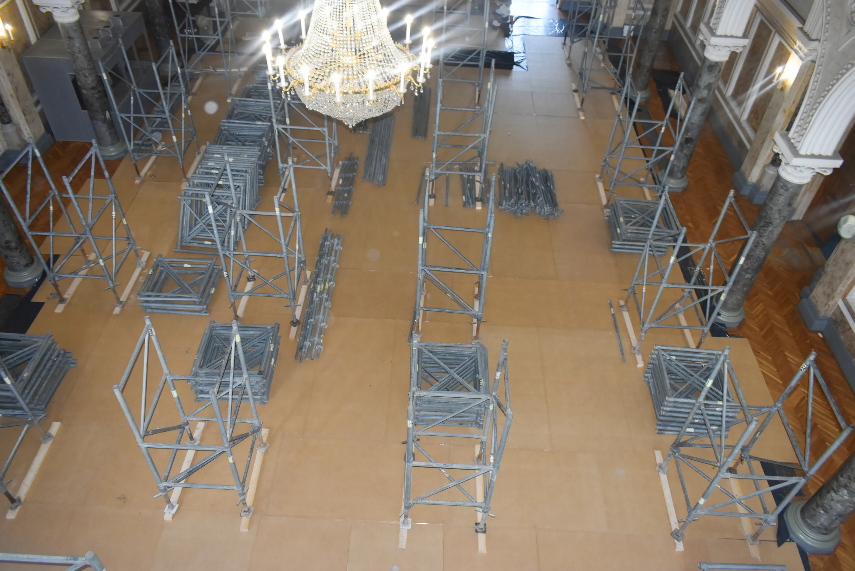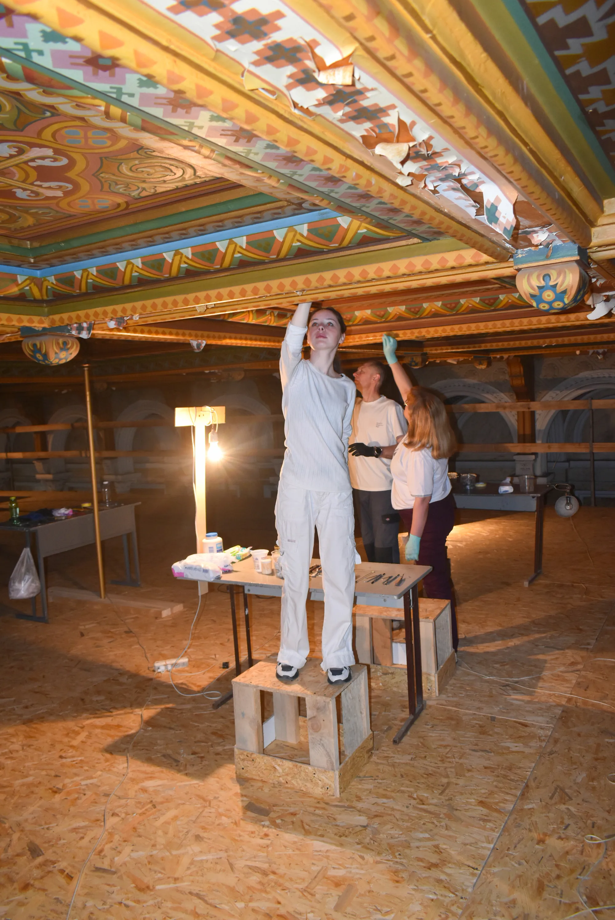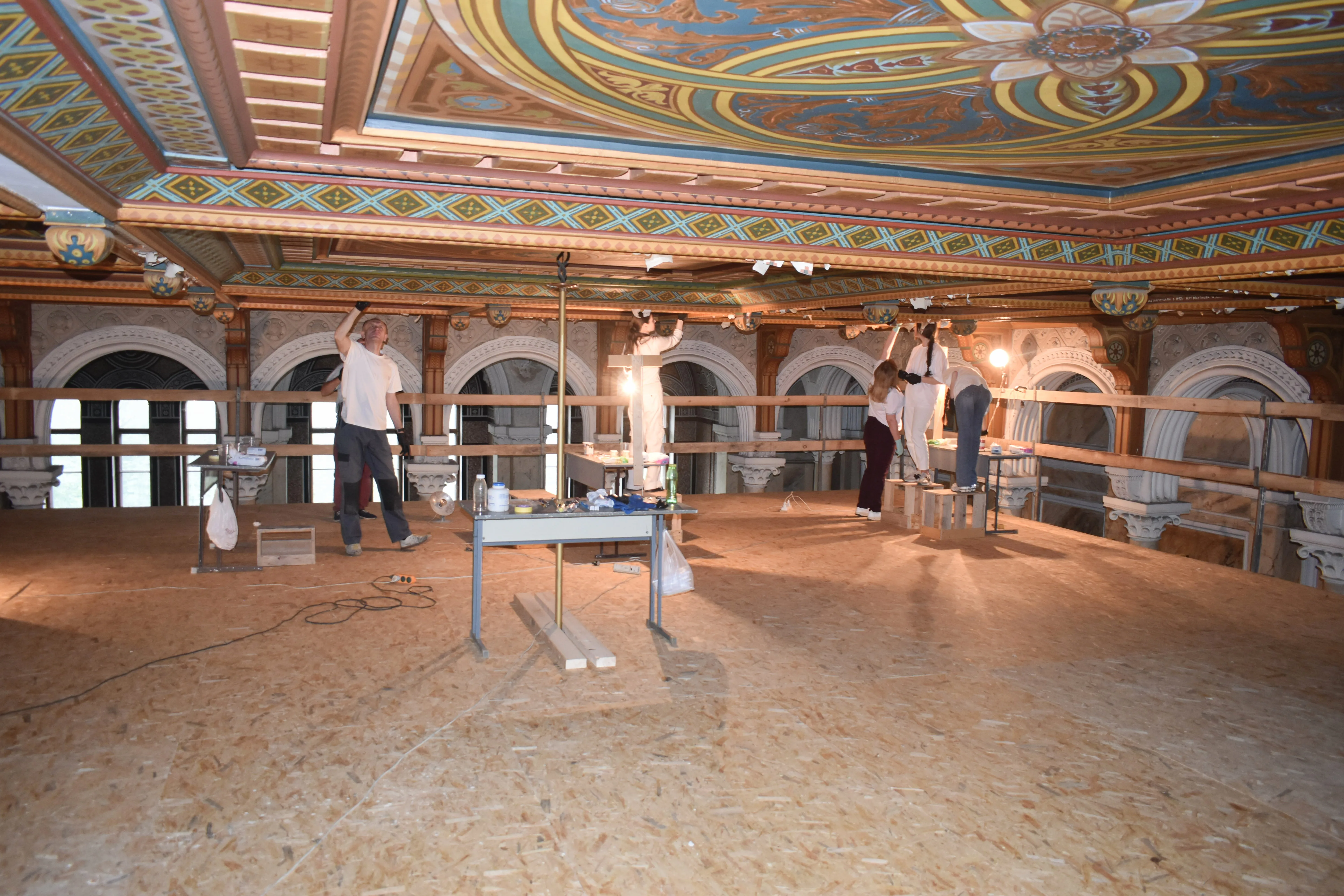 Наразі всі процедурні питання вирішені і реставратори приступили до виконання робіт. Впродовж понад двох тижнів відбувалося встановлення, необхідного для проведення реставраційних робіт, риштування, яке сягає майже стелі Мармурової зали, висота якої понад одинадцять метрів. Розпочалися роботи з видалення забруднення та плісняви з поверхні кесонової стелі, укріплення фарби та деревини, а після дотримання усіх технологічних норм - відновлення живопису у тих місцях, де втрачено колір, малюнки і орнамент.