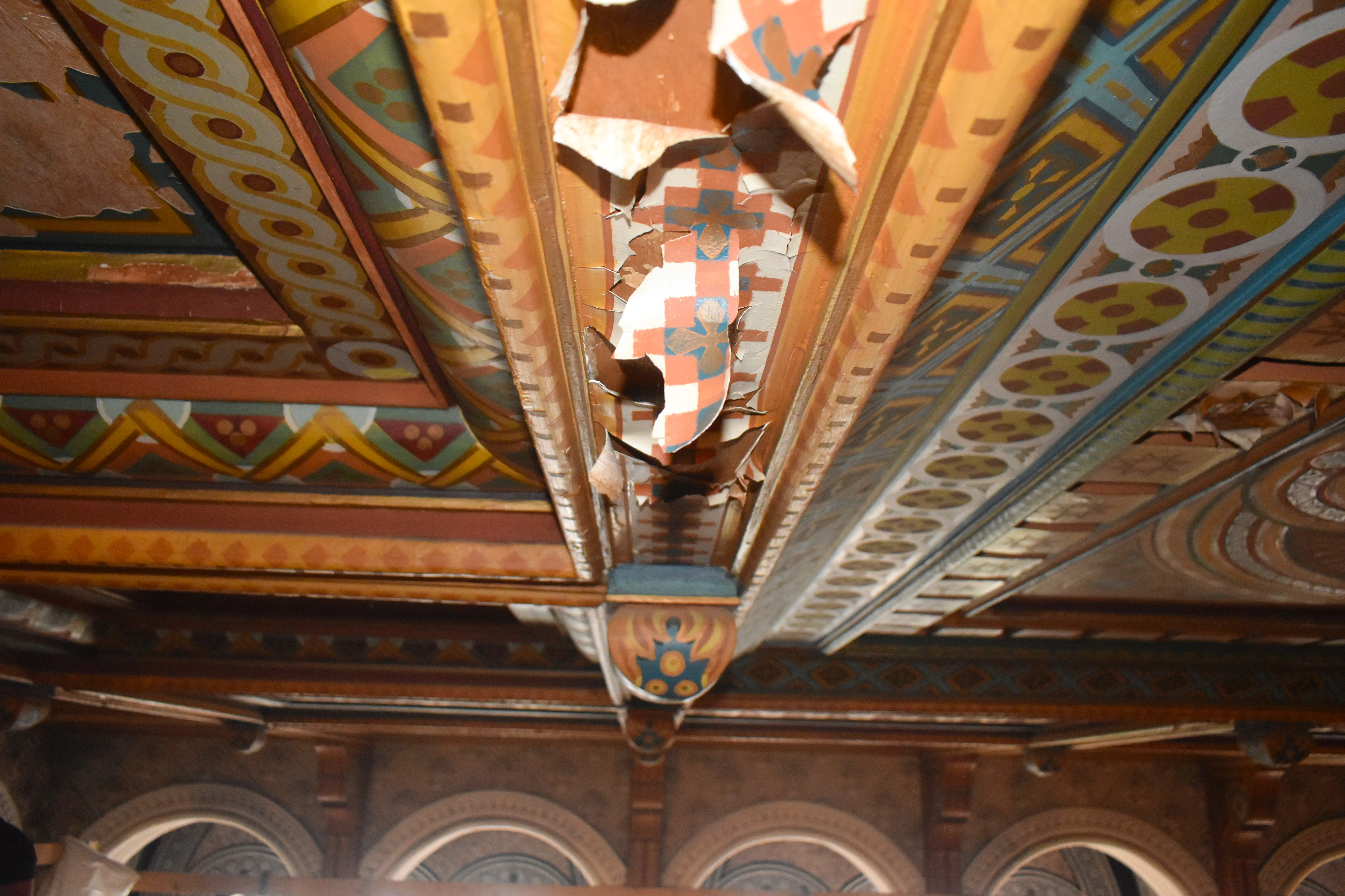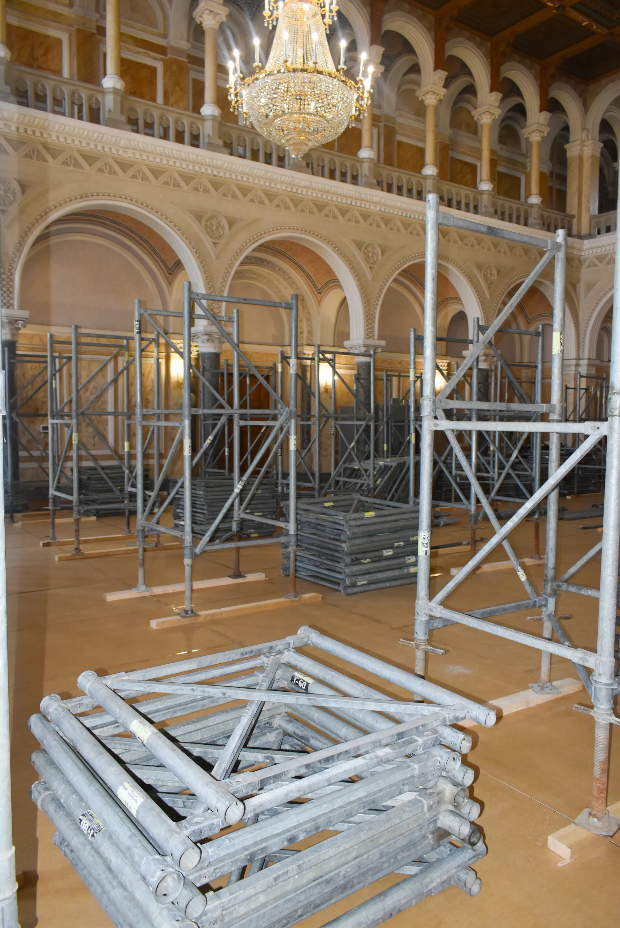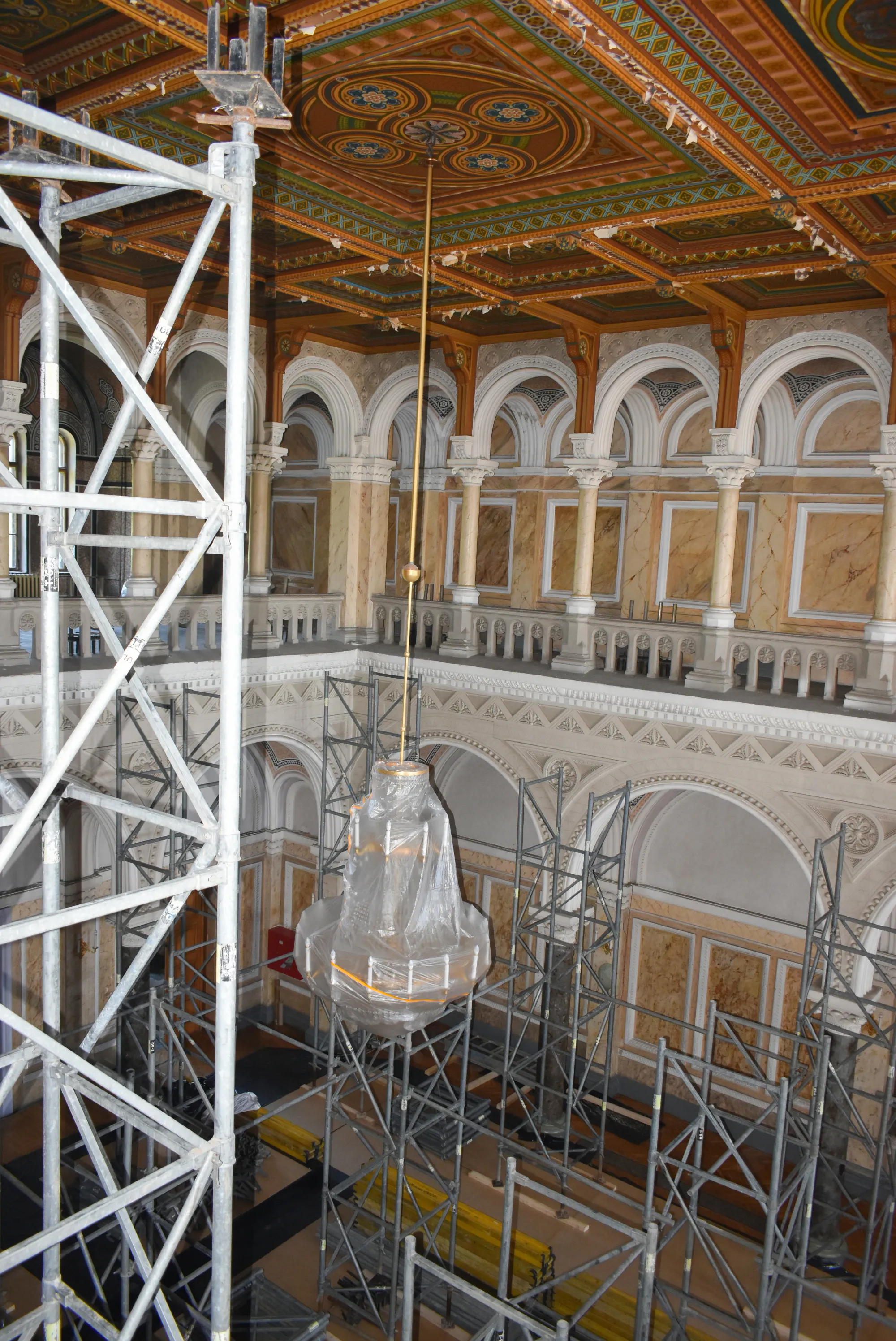 Наразі всі процедурні питання вирішені і реставратори приступили до виконання робіт. Впродовж понад двох тижнів відбувалося встановлення, необхідного для проведення реставраційних робіт, риштування, яке сягає майже стелі Мармурової зали, висота якої понад одинадцять метрів. Розпочалися роботи з видалення забруднення та плісняви з поверхні кесонової стелі, укріплення фарби та деревини, а після дотримання усіх технологічних норм - відновлення живопису у тих місцях, де втрачено колір, малюнки і орнамент.