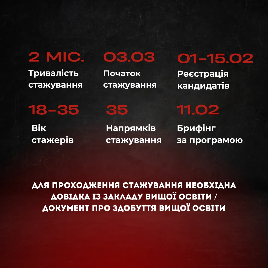 Стажування триватиме два місяці, а кінцевий термін подачі заявок на програму – 15 лютого 2025 року за посиланням.