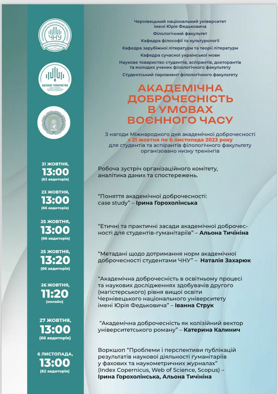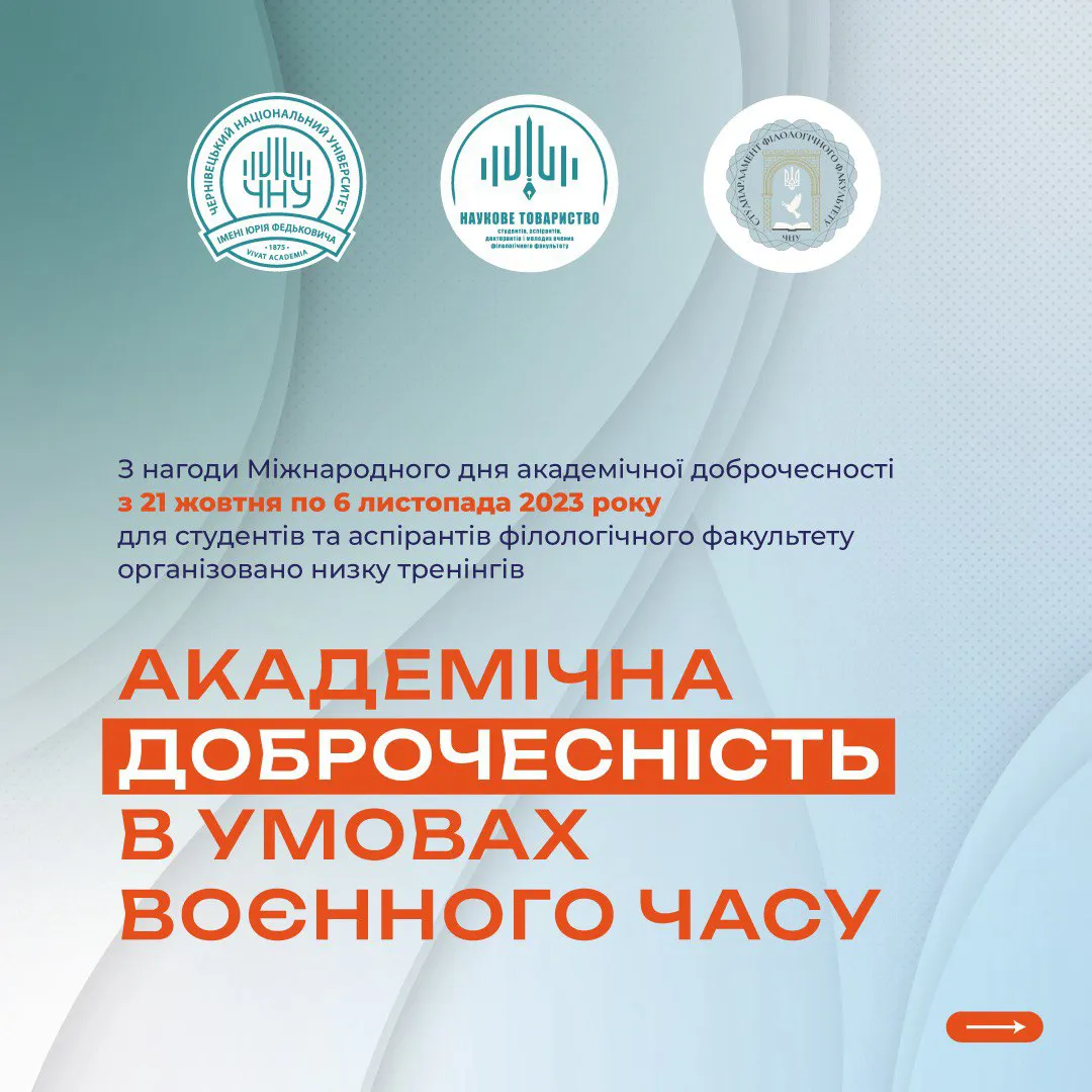 З нагоди Міжнародного дня академічної доброчесності з 21 жовтня по 6 листопада для студентів та аспірантів філологічного факультету Чернівецького національного університету імені Юрія Федьковича організовано низку тренінгів.