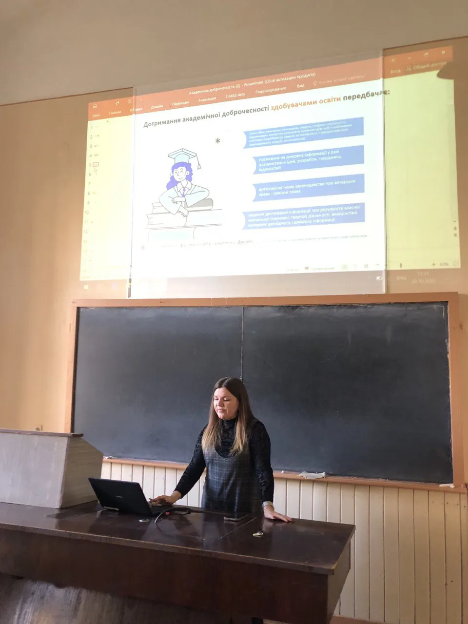 - 25 жовтня кандидатка філологічних наук, доцентка кафедри зарубіжної літератури та теорії літератури, голова Ради молодих учених філологічного факультету Альона Тичініна організувала тренінг “Етичні та практичні засади академічної доброчесності для студентів-гуманітаріїв”, включивши до нього й доповідь студентки 2 курсу, голови Студентського парламенту філологічних наук Наталії Захарюк “Метадані щодо дотримання норм академічної доброчесності студентами ЧНУ”;