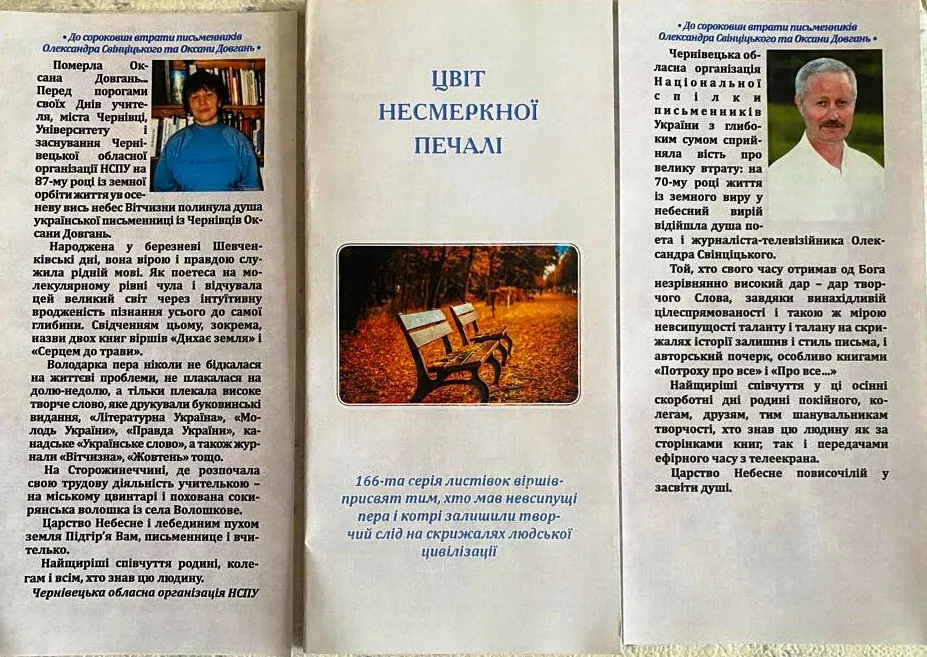 Вшановуючи пам'ять буковинських письменників, які відійшли у вічність, в Науковій бібліотеці Чернівецького національного університету імені Юрія Федьковича відбулася презентація 166-ї серії поетичних листівок віршів-присвят спеціального проєкту Чернівецької обласної організації Національної спілки письменників за підтримки авторів, а саме: Цвіт несмертної печалі: серія листівок до сороковин втрати українських письменників Олександра Свінцицького та Оксани Довгань/авт. ідеї, упоряд. В. Джуран. Чернівці: Родовід, 2024. 7 л.