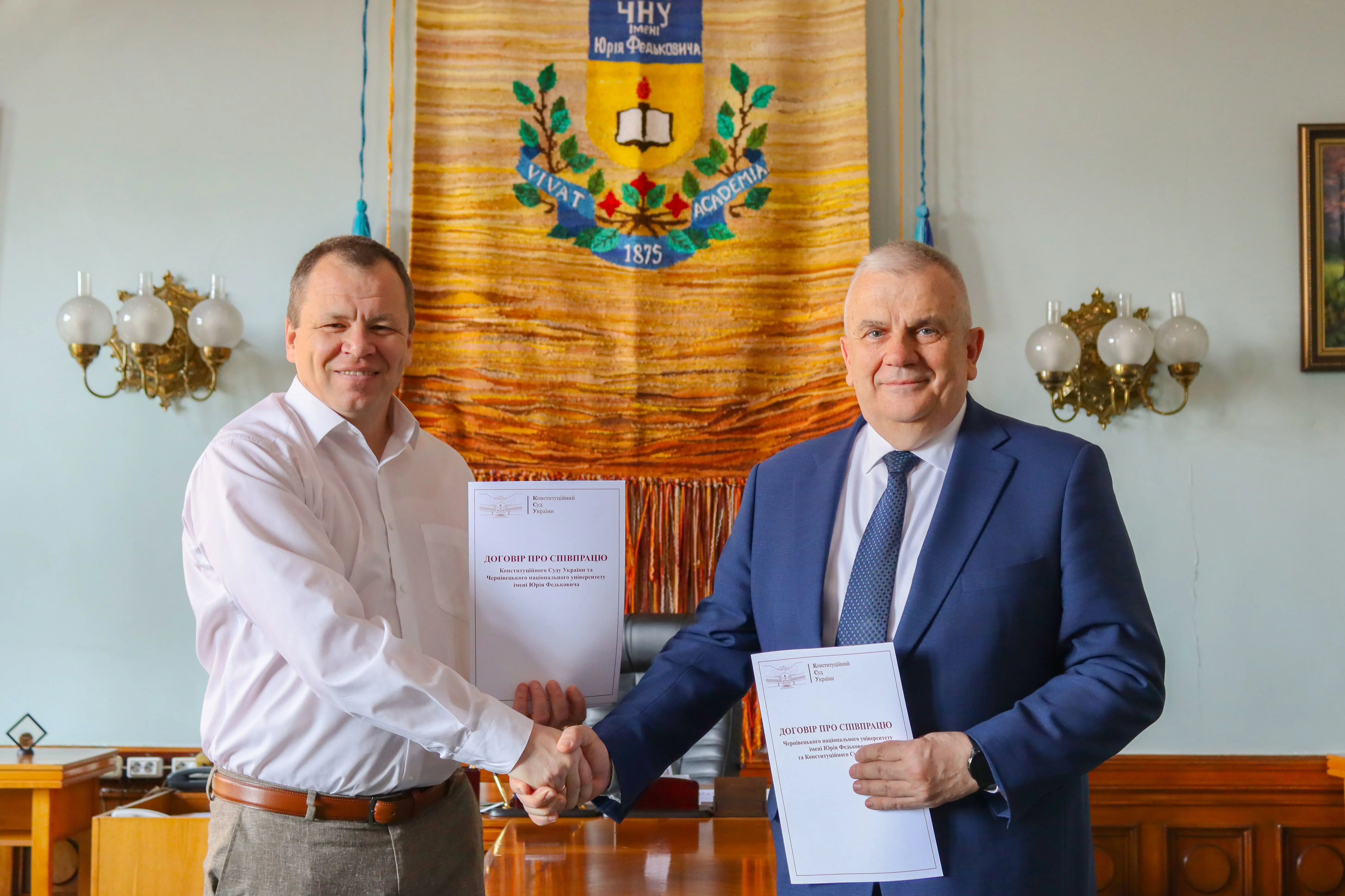 13 травня в кабінеті ректора Чернівецького національного університету імені Юрія Федьковича відбулася зустріч, у рамках якої було підписано договір про співпрацю між університетом та Конституційним Судом України. Документ підписали ректор ЧНУ Руслан Білоскурський та виконувач обов’язків Голови Конституційного Суду України Олександр Петришин.