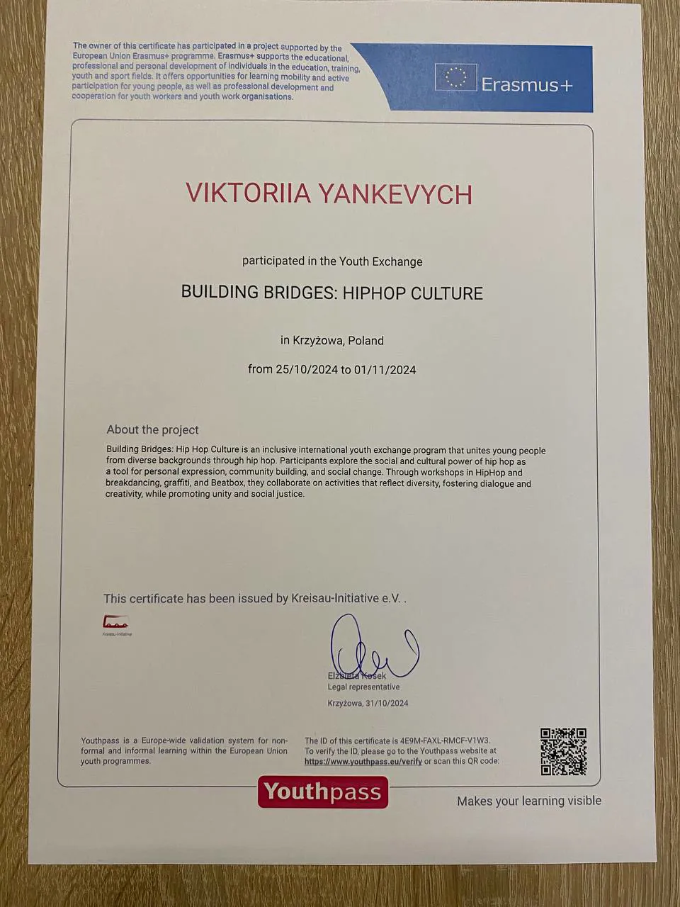 З 24 жовтня до 2 листопада в Міжнародному центрі зустрічей молоді в Кшижові, Польща, відбувся міжнародний інклюзивний проєкт „BRÜCKENSCHLAG", в рамках заявки № 2023-2-DE04-KA105-019882 та затверджений Німецьким національним агентством програми Еразмус+ (Erasmus+/Youth for Europe, National Agency Erasmus+).