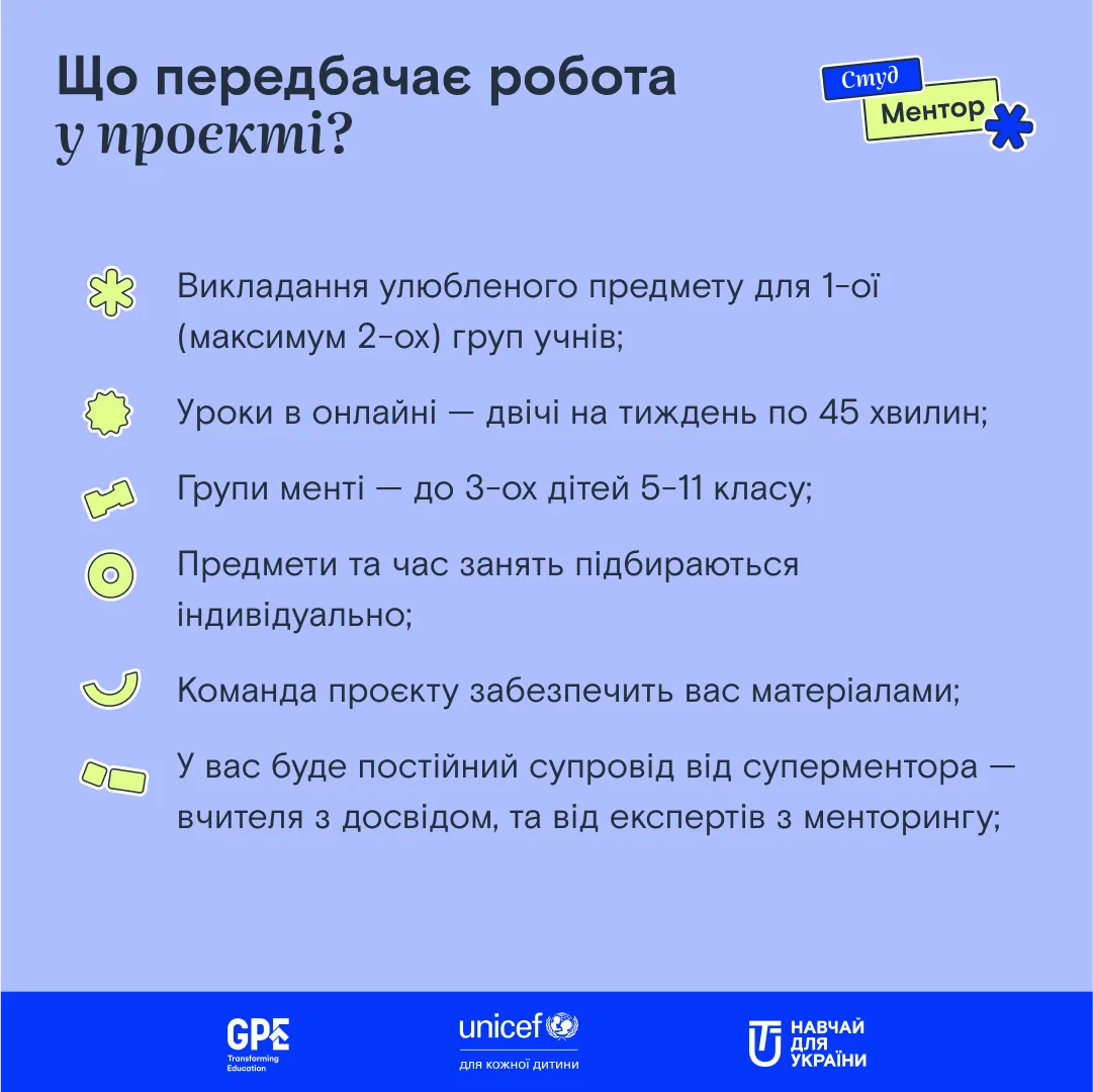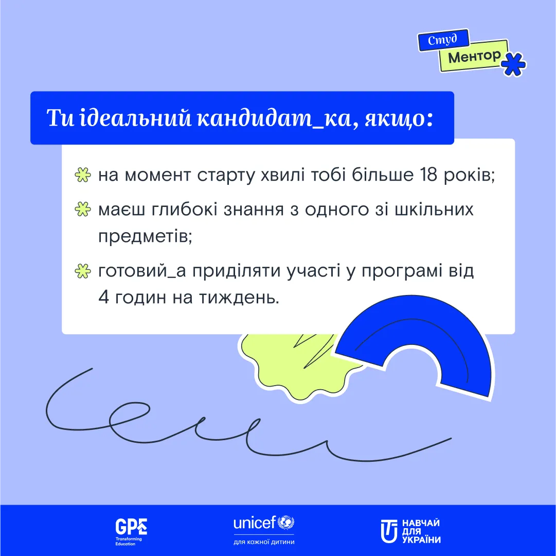 Програма реалізується за підтримки ЮНІСЕФ та фінансується Глобальним партнерством заради освіти (GPE). Охочі приєднатися до «СтудМентор» можуть заповнити форму за посиланням.