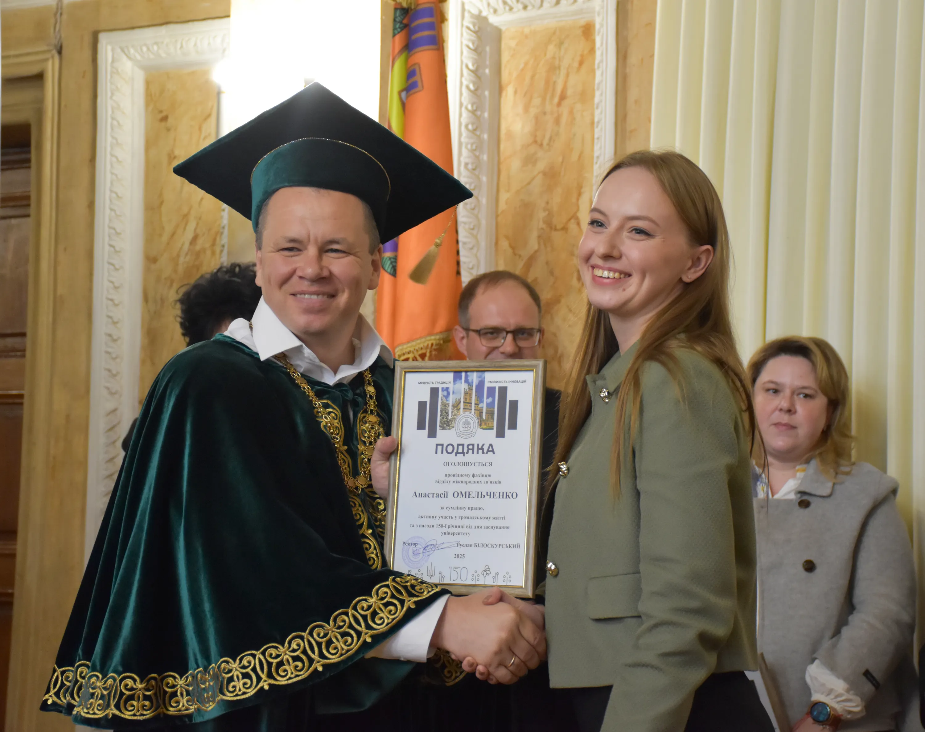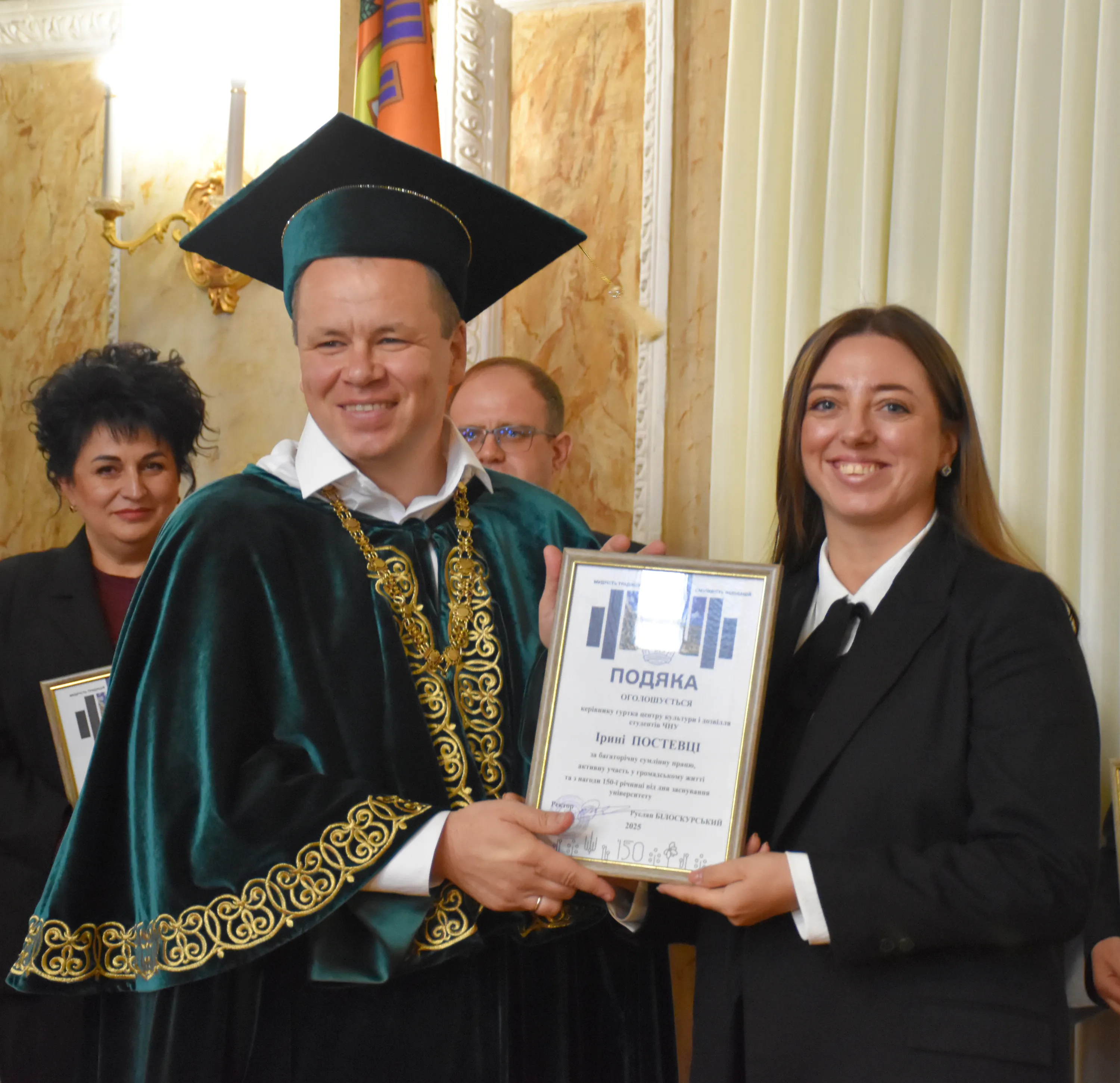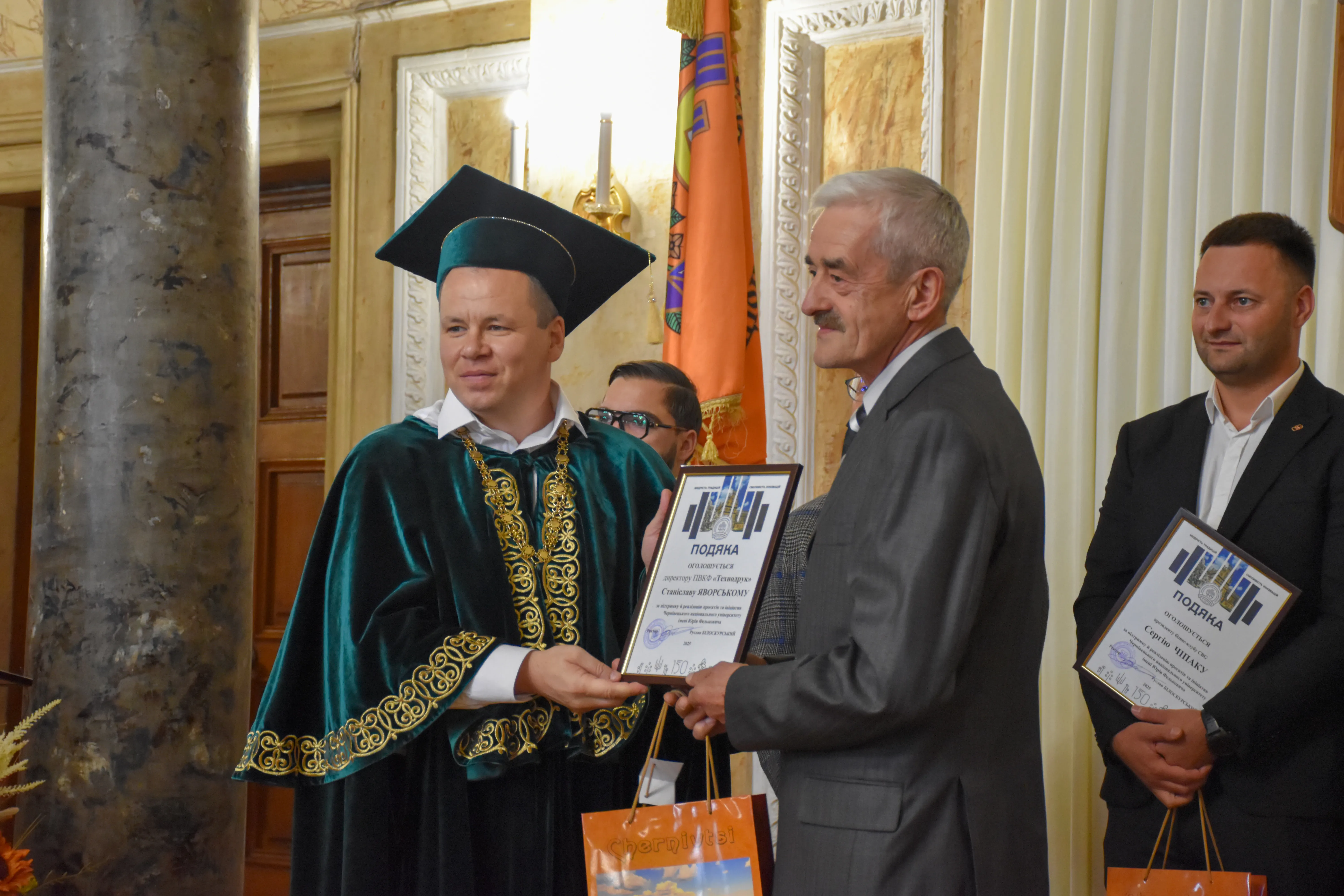 Участь у заході взяла уповноважена Верховної Ради України з прав людини, випускниця педагогічного факультету Ірина Ісопенко, яка вручила відзнаки Дмитру Федорцову, Віталію Вдовічену та Миколі Косташу. Водночас ректор ЧНУ відзначив подяками викладачів, співробітників та молодих науковців, які успішно захистили дисертації у 2025 році, а також меценатів та партнерів університету, серед яких представники IT-галузі, бізнес-клубів та провідних компаній Чернівців.
