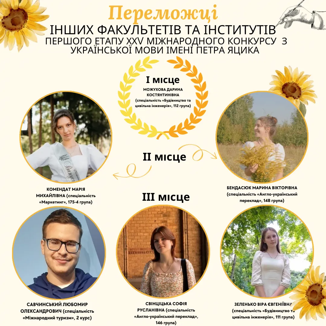 - Свінціцька Софія Русланівна (спеціальність «Англо-український переклад», 146 група).