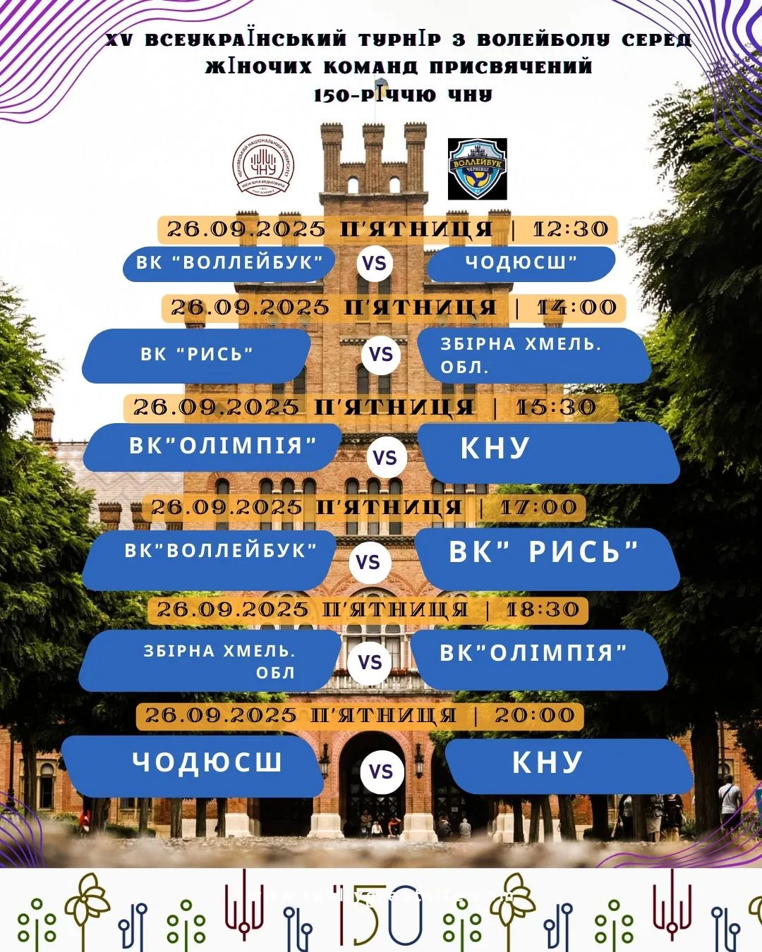 Уже цими вихідними, 26–28 вересня, Чернівці стануть спортивним центром України – у залі Чернівецької обласної ДЮСШ (вул. Небесної Сотні, 6) відбудеться XV Всеукраїнський турнір з волейболу серед жіночих команд, присвячений 150-річчю Чернівецького національного університету імені Юрія Федьковича.