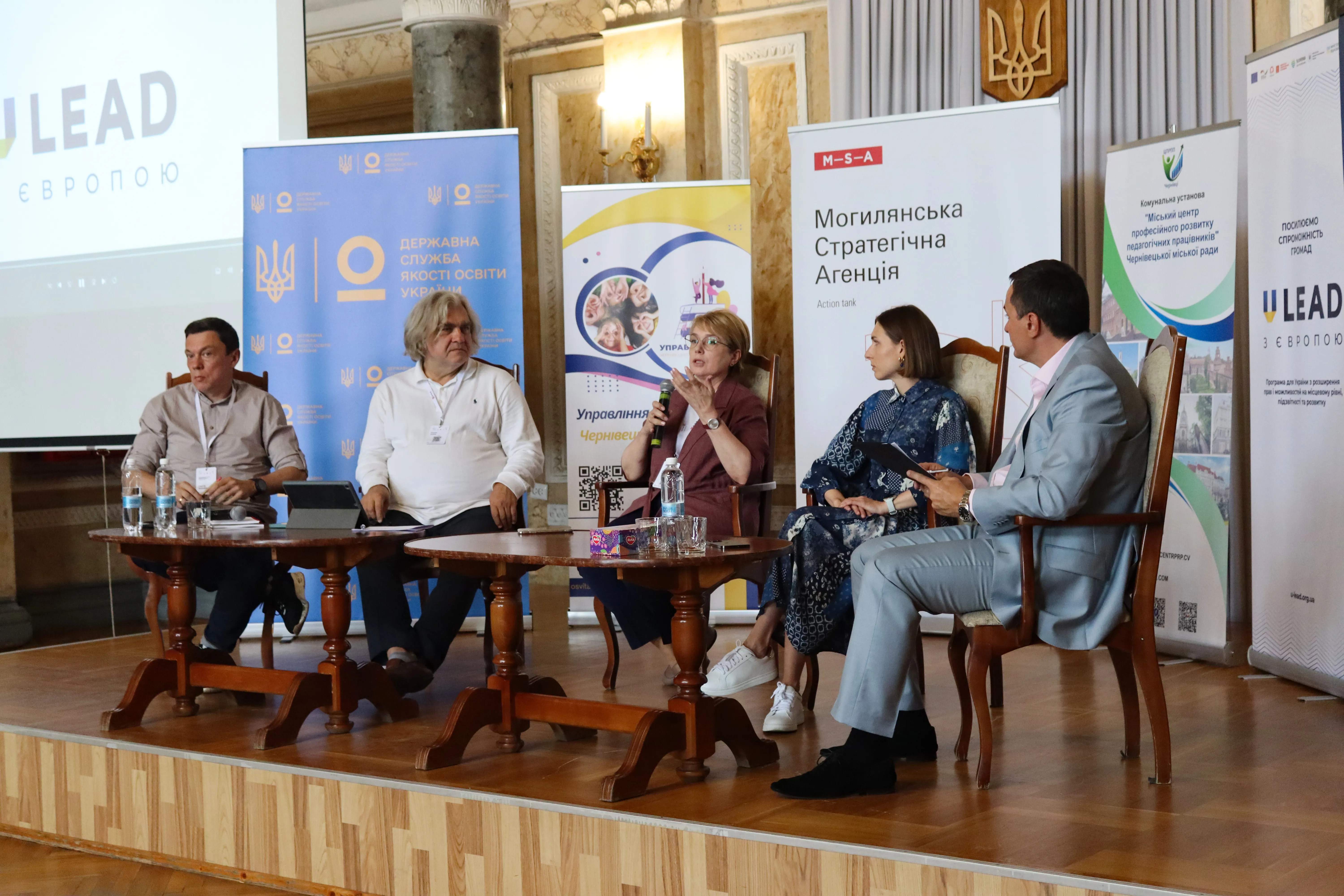 Наступним етапом роботи стала панельна дискусія «Як освіта може формувати цінності та чесноти, притаманні цілісній (доброчесній) особистості» модератором якої був Руслан Гурак, голова Державної служби якості освіти України, кандидат юридичних наук, випускник програми «Школа стратегічного архітектора» kmbs. У першій дискусії взяли участь: