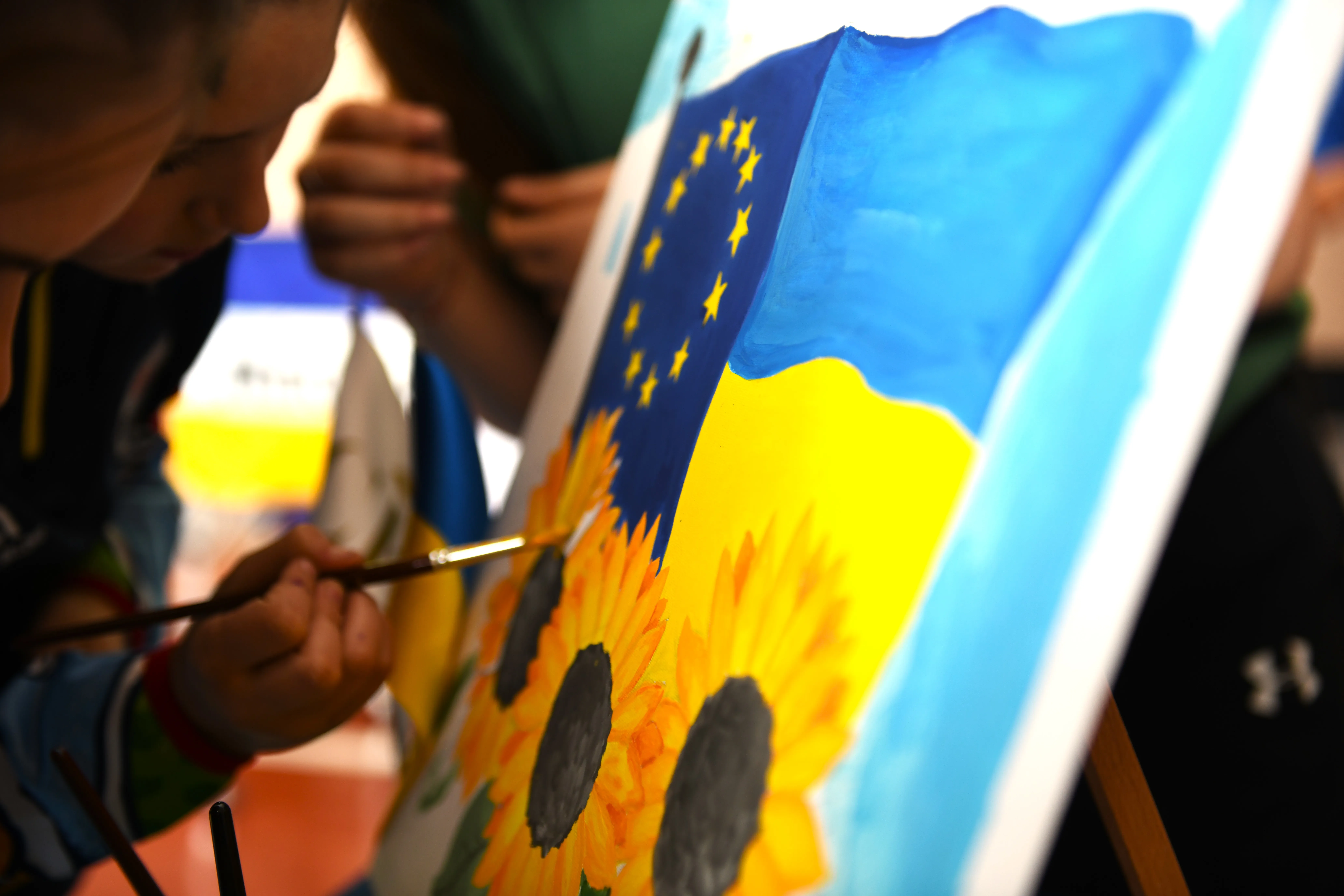 Кульмінацією благодійного заходу стало малювання великої картини, де кожен маленький учасник міг залишити свій слід, розмальовуючи її в кольорах прапорів України та Євросоюзу, символізуючи єдність та надію.