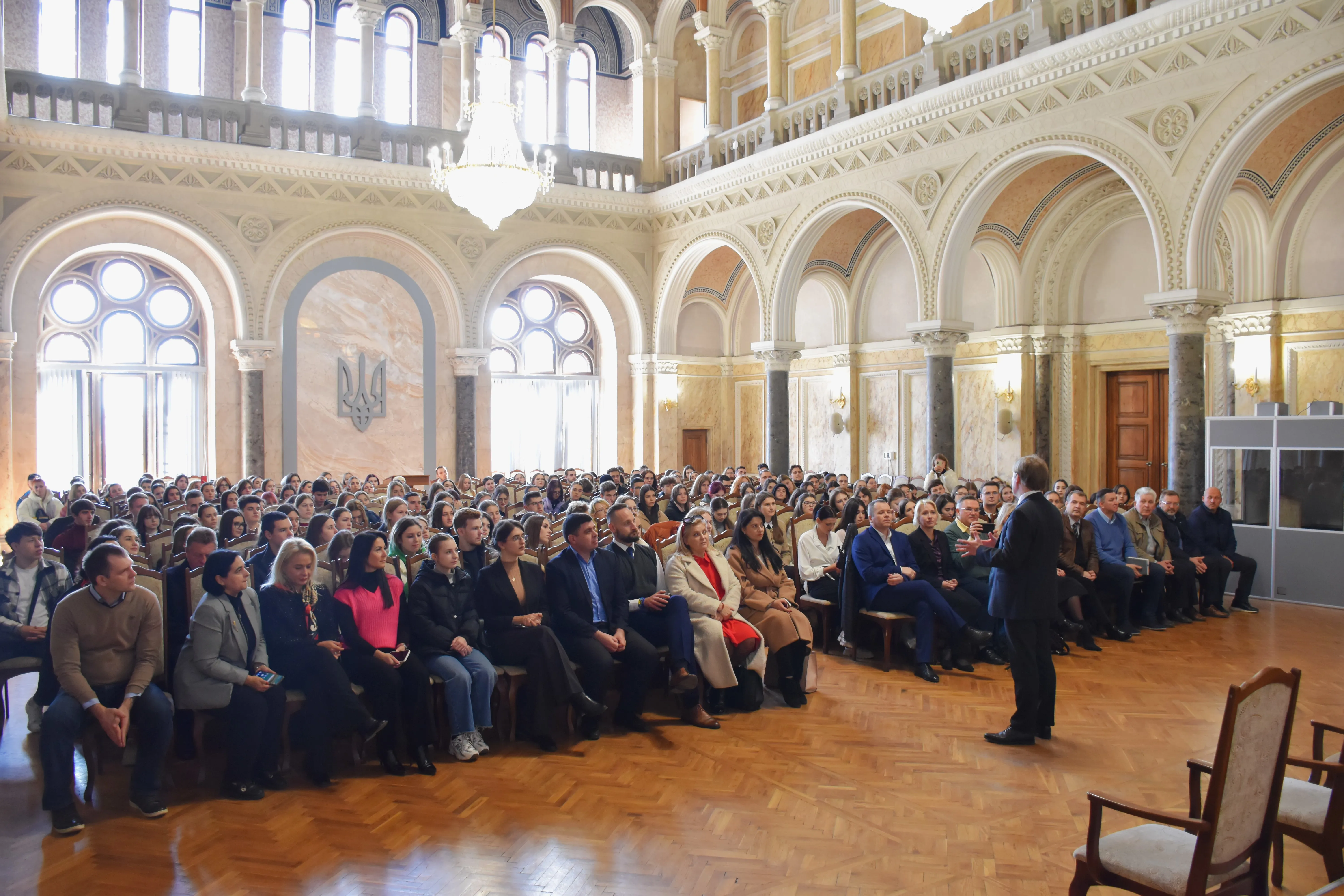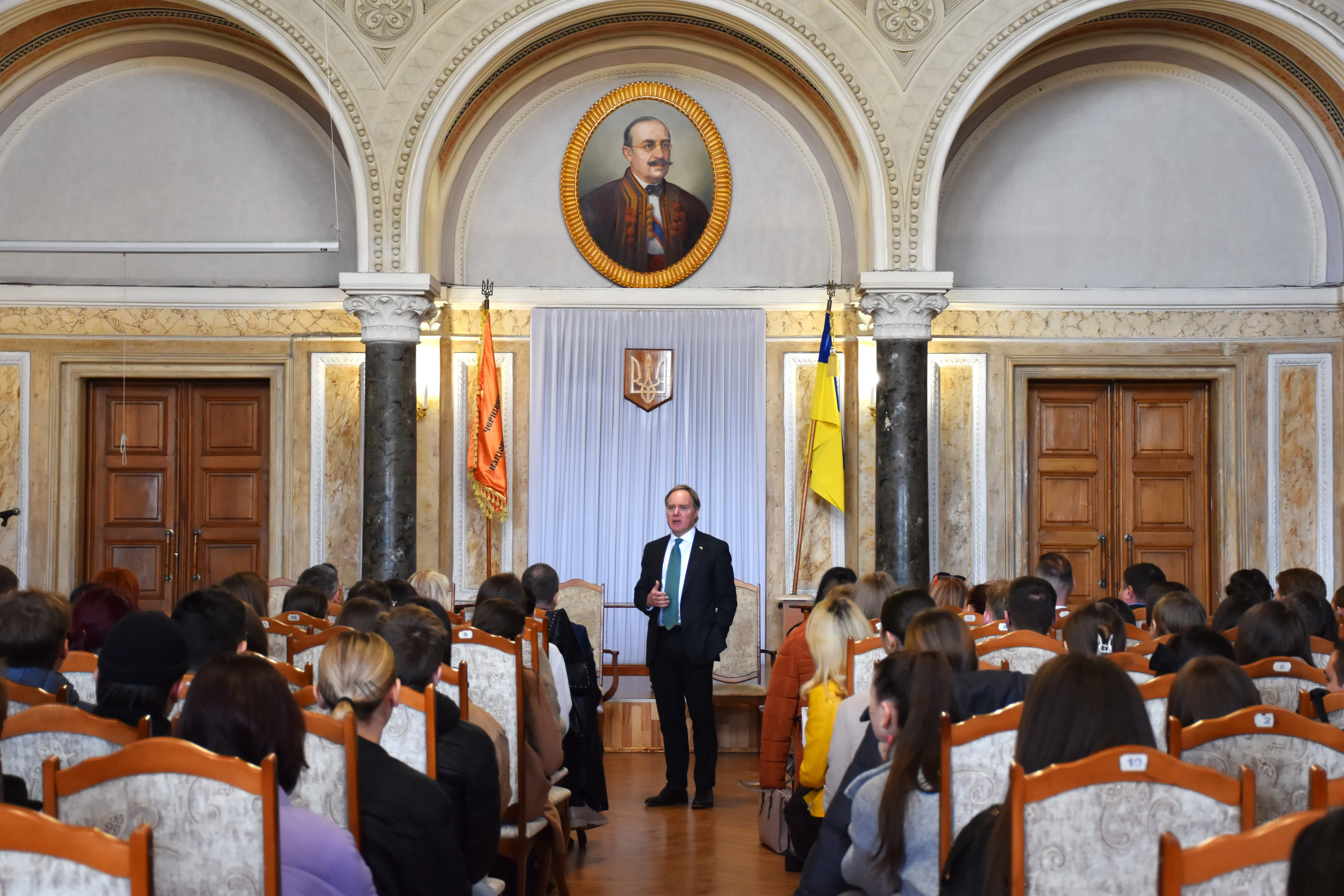 Після розмови з керівництвом університету, Мартін Гарріс зустрівся зі студентами в Мармуровій залі Чернівецького національного університету імені Юрія Федьковича. Посол зазначив, що дуже хотів потрапити до нашого університету та познайомитись із його студентами. На початку зустрічі Мартін Гарріс поділився деталями своєї роботи та окреслив, яким чином Посольство допомагає Україні. Після цього в студентів була змога поставити питання й почути на них відповіді. Приємно відзначити, що спілкування відбувалось як українською, так і англійською мовами. Це є черговим підтвердженням того, що наші студенти приділяють значну увагу вивченню іноземної мови, адже розуміють важливість її використання, зокрема, для покращення комунікації з міжнародними представниками.