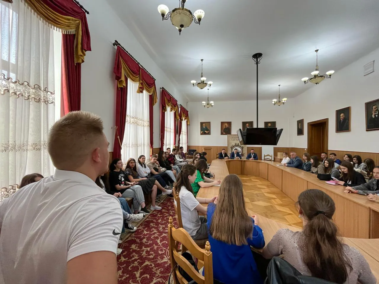 На зустрічі були присутні Віталій Анатолійович Вдовічен, декан юридичного факультету, д.ю.н, професор; Олександр Дмитрович Максимюк, заступник відповідального секретаря приймальної комісії університету, к.ю.н., доцент кафедри теорії права та прав людини, Ігор Васильович Ковбас, д.ю.н., доцент кафедри публічного права, а також студенти 1-го курсу юридичного факультету.