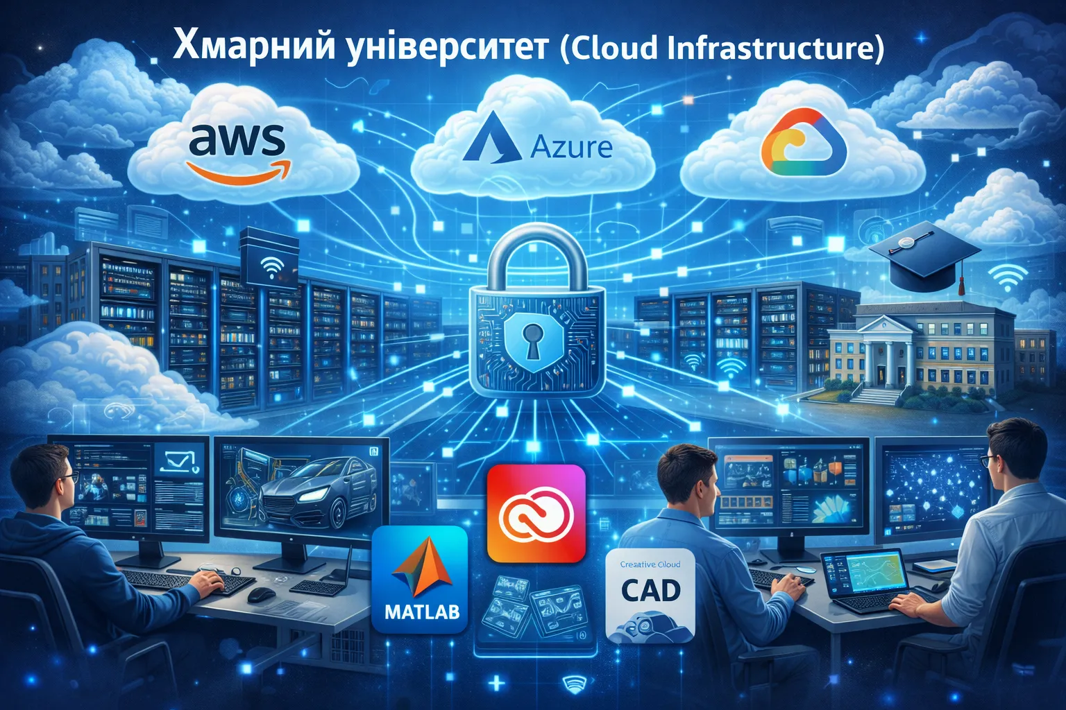 Ініціатива передбачає розгортання університетської хмарної інфраструктури (на базі AWS/Azure/Google Cloud) та забезпечення централізованого доступу до ліцензійного професійного ПЗ (MATLAB, Adobe CC, CAD). Це трансформує навчання у гнучку цифрову екосистему, надаючи студентам можливість виконувати ресурсомісткі завдання – від 3D-моделювання до обробки Big Data – на віртуальних потужностях промислового рівня з будь-якої точки світу, гарантуючи при цьому кібербезпеку та академічну доброчесність.
