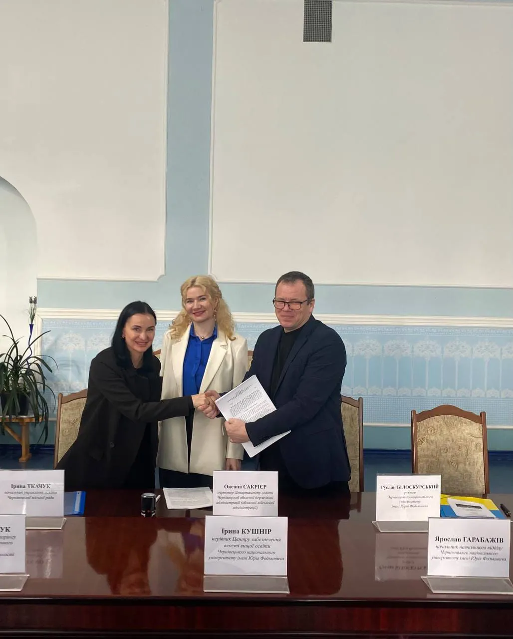 підписано договір про співпрацю між Чернівецьким національним університетом імені Юрія Федьковича та Департаментом освіти і науки Чернівецької обласної військової адміністрації, Управлінням освіти Чернівецької міської ради та Управлінням Державної служби якості освіти у Чернівецькій області.